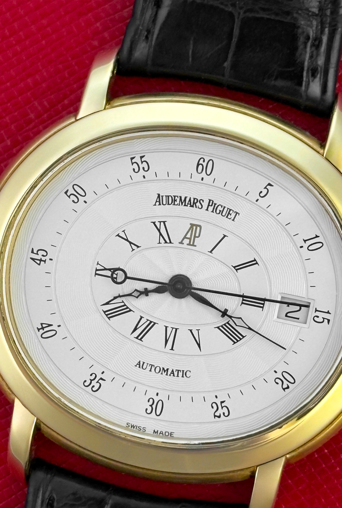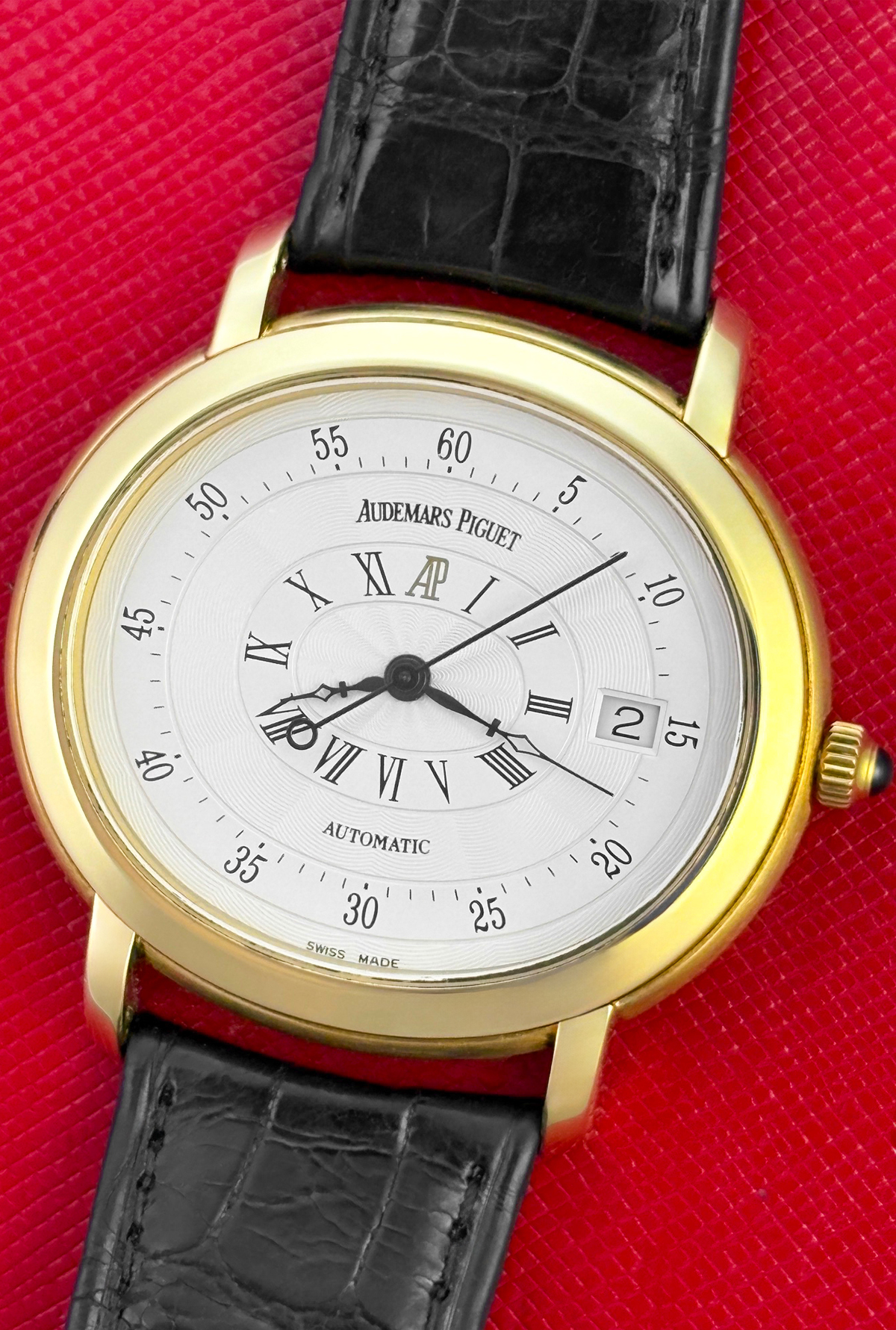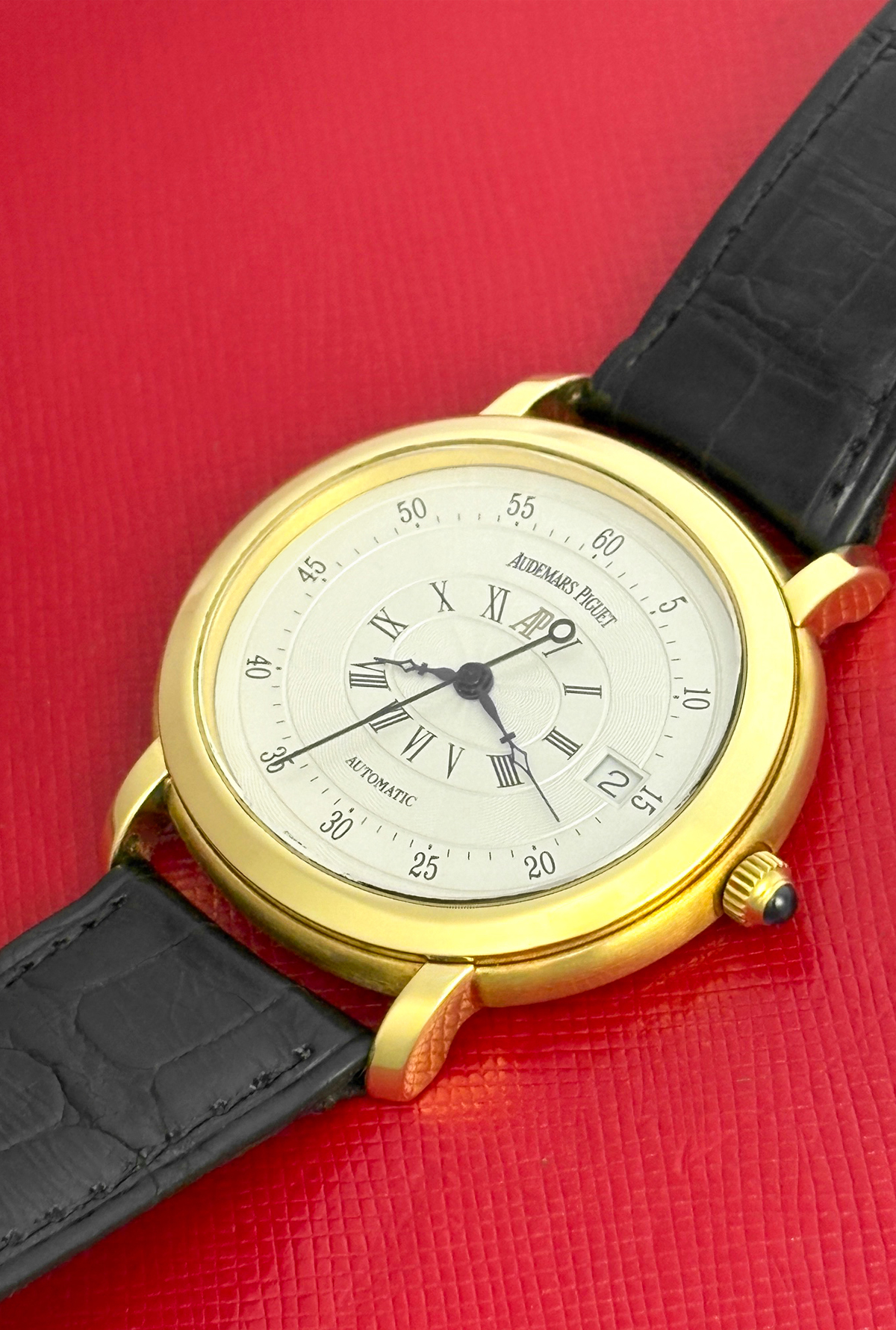 Strap: Black alligator strap with 18k Yellow Gold Audemars Piguet deployant clasp