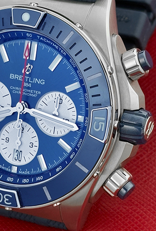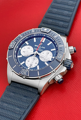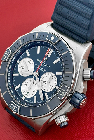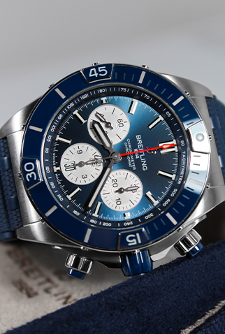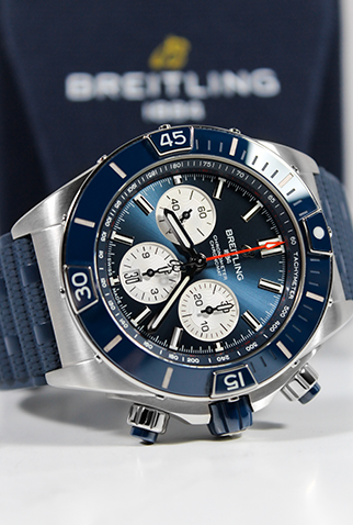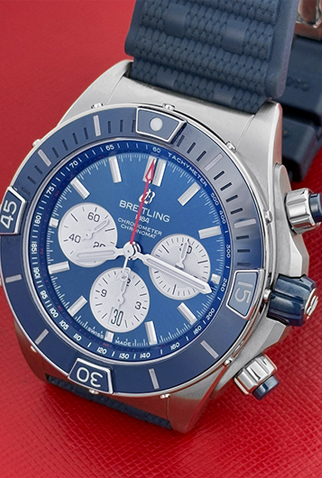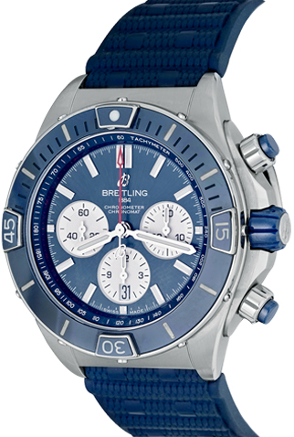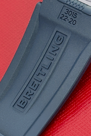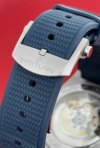 Strap: Dark blue Breitling rubber strap with Stainless Steel Breitling with deployant push-button to unlock clasp