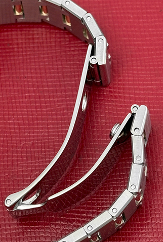 Case Material: Stainless Steel round style case with 18k Rose Gold bezel (23mm dia.)