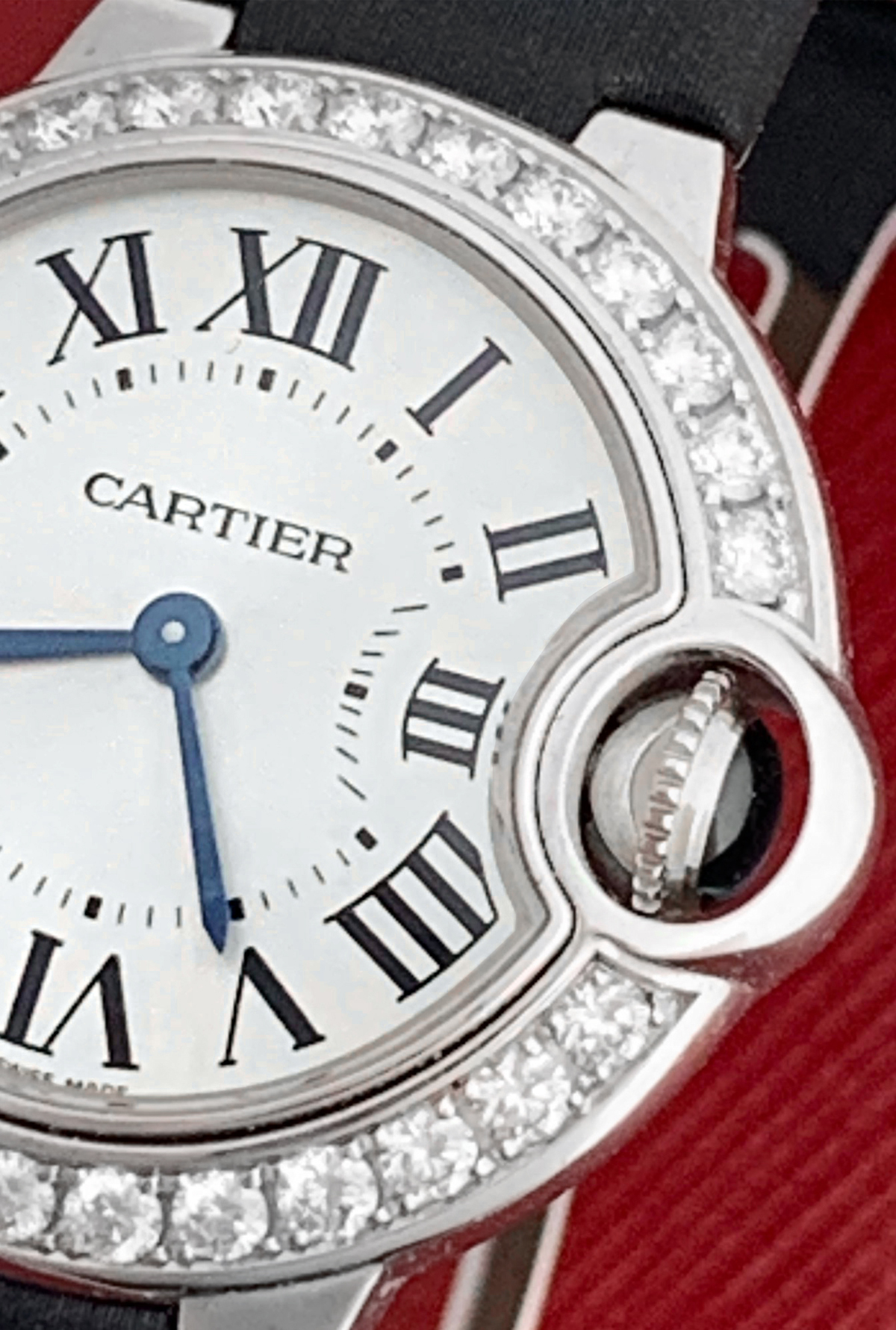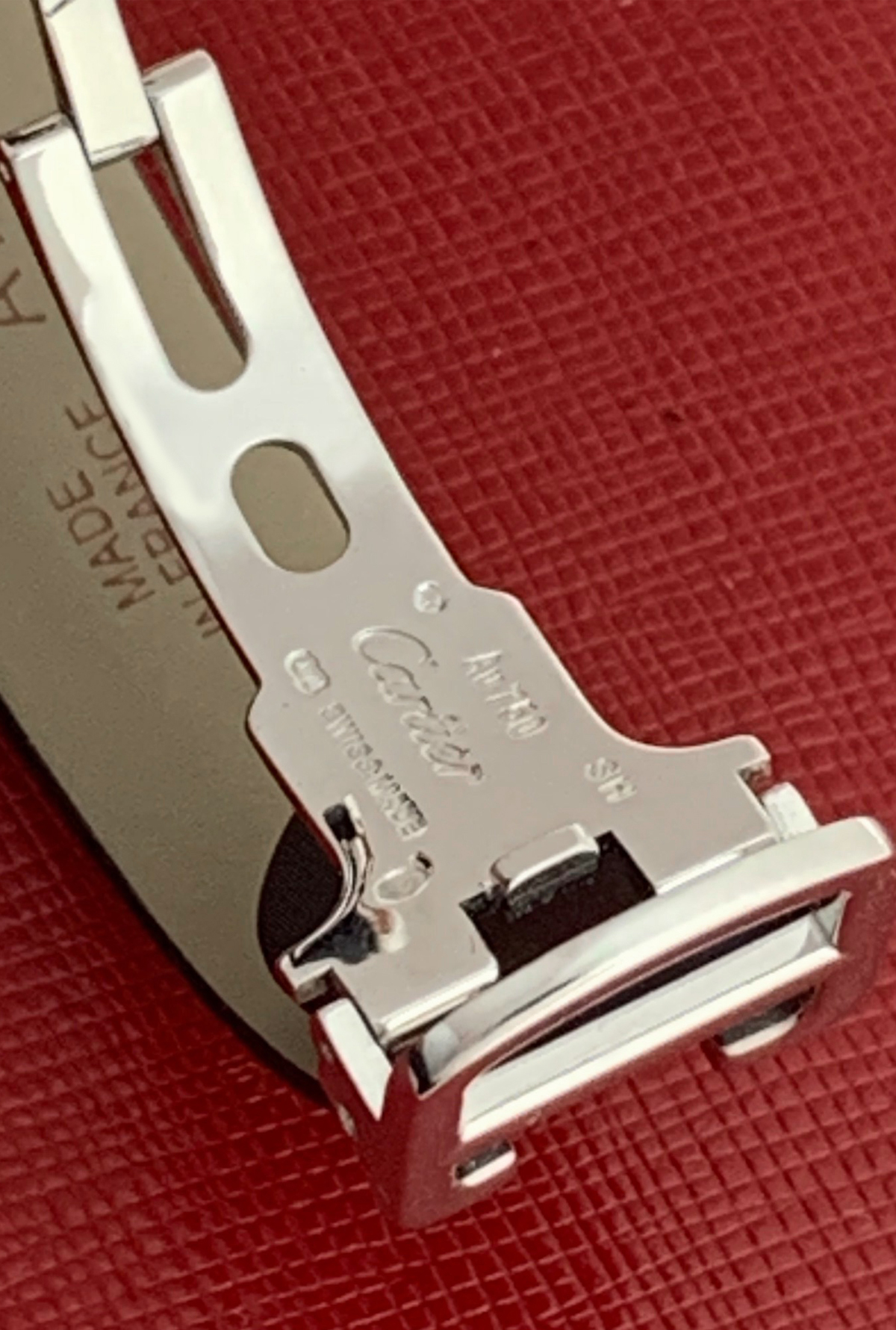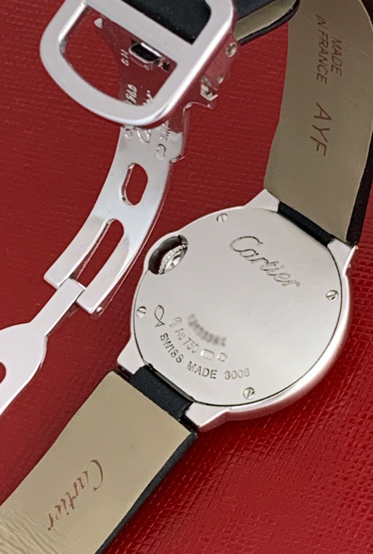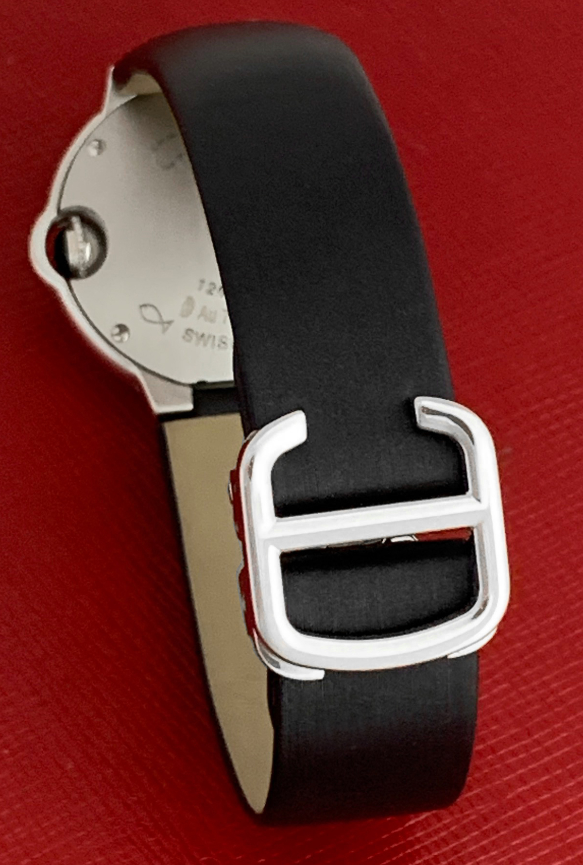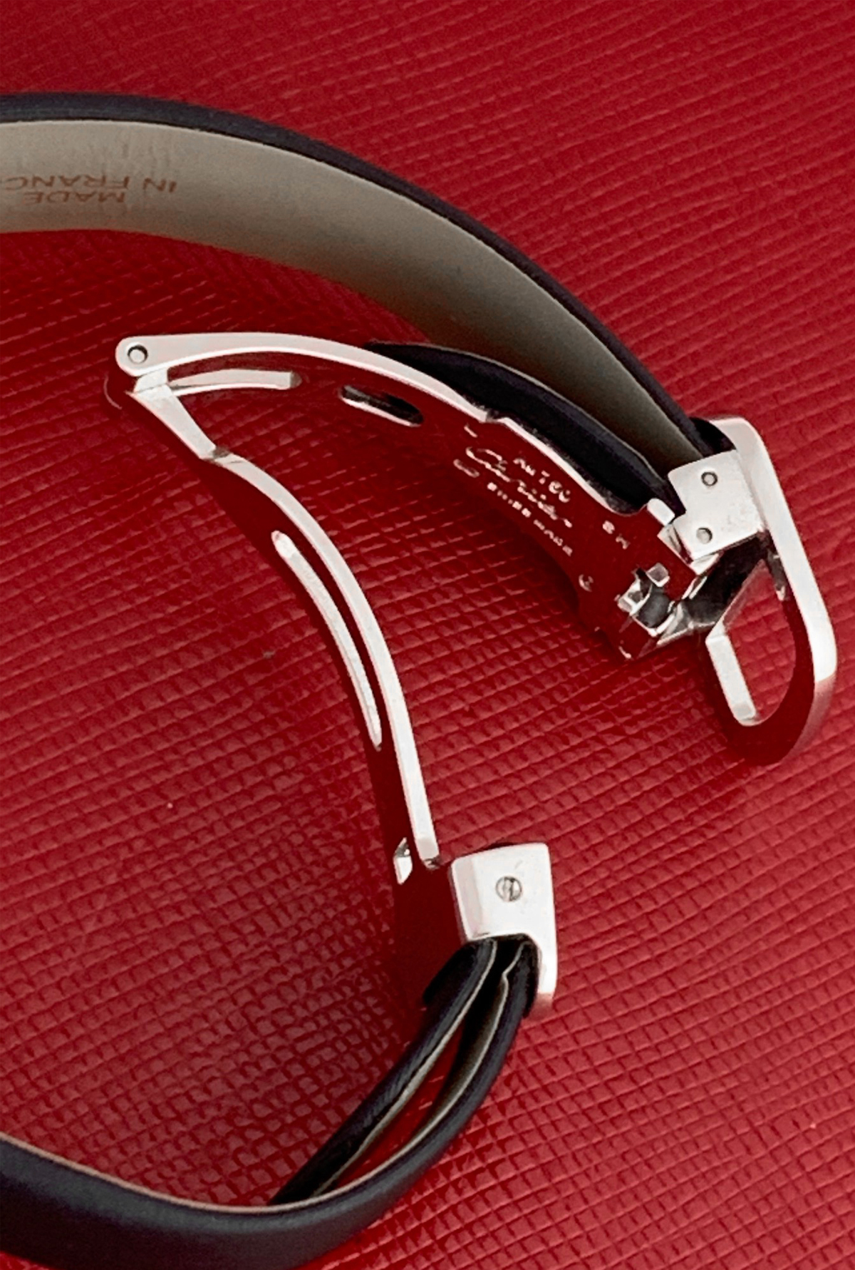 Strap: Black strap with 18k White Gold Cartier deployant clasp