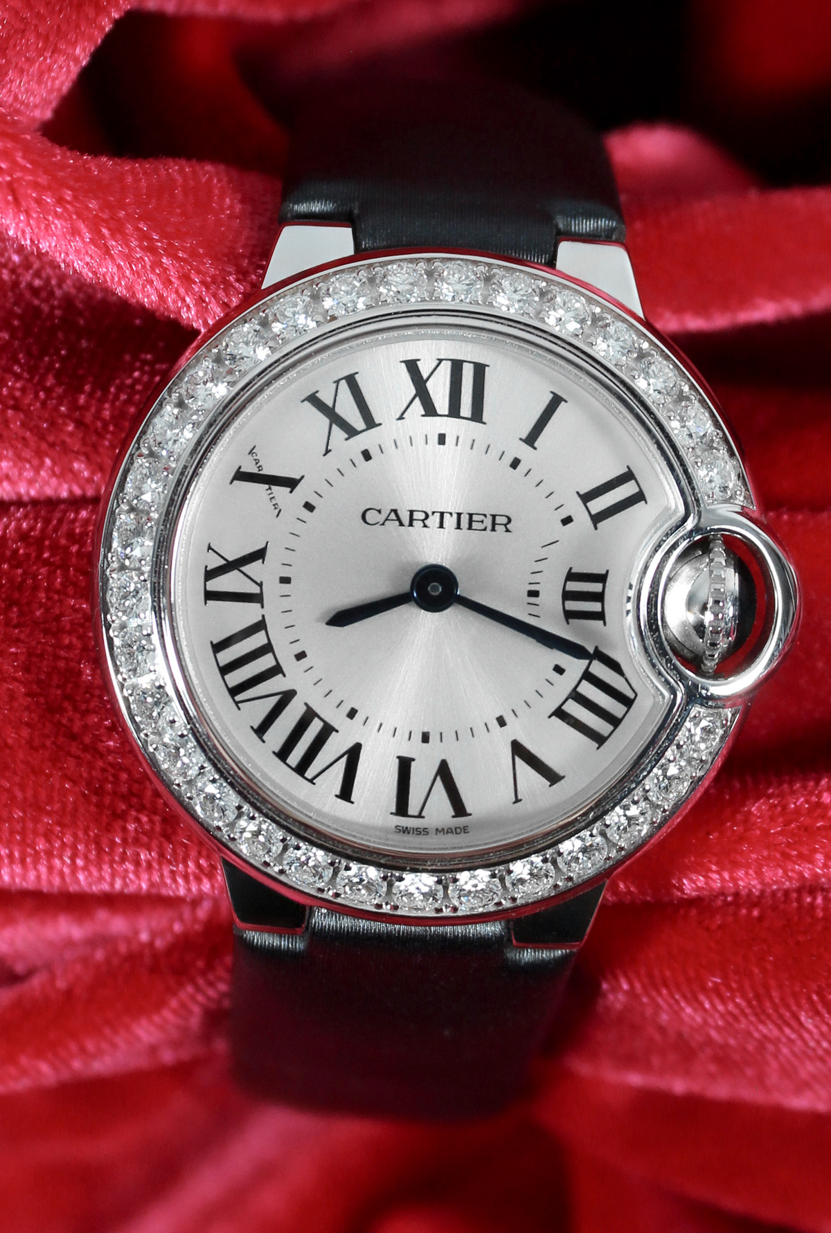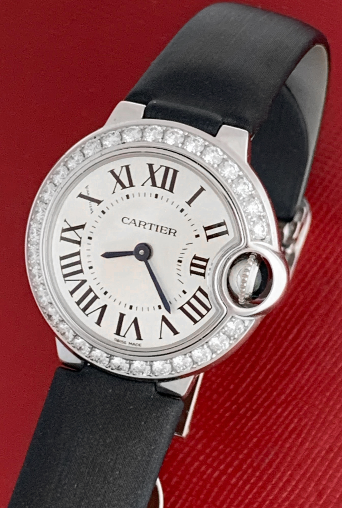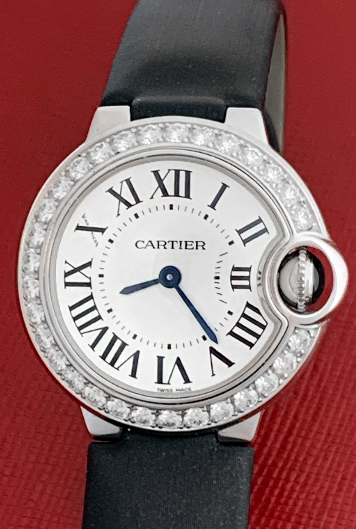 Case Material: 18k White Gold round style case with Cartier Diamond bezel (28mm dia.). Water Resistant to 30 Meters – 100 Feet