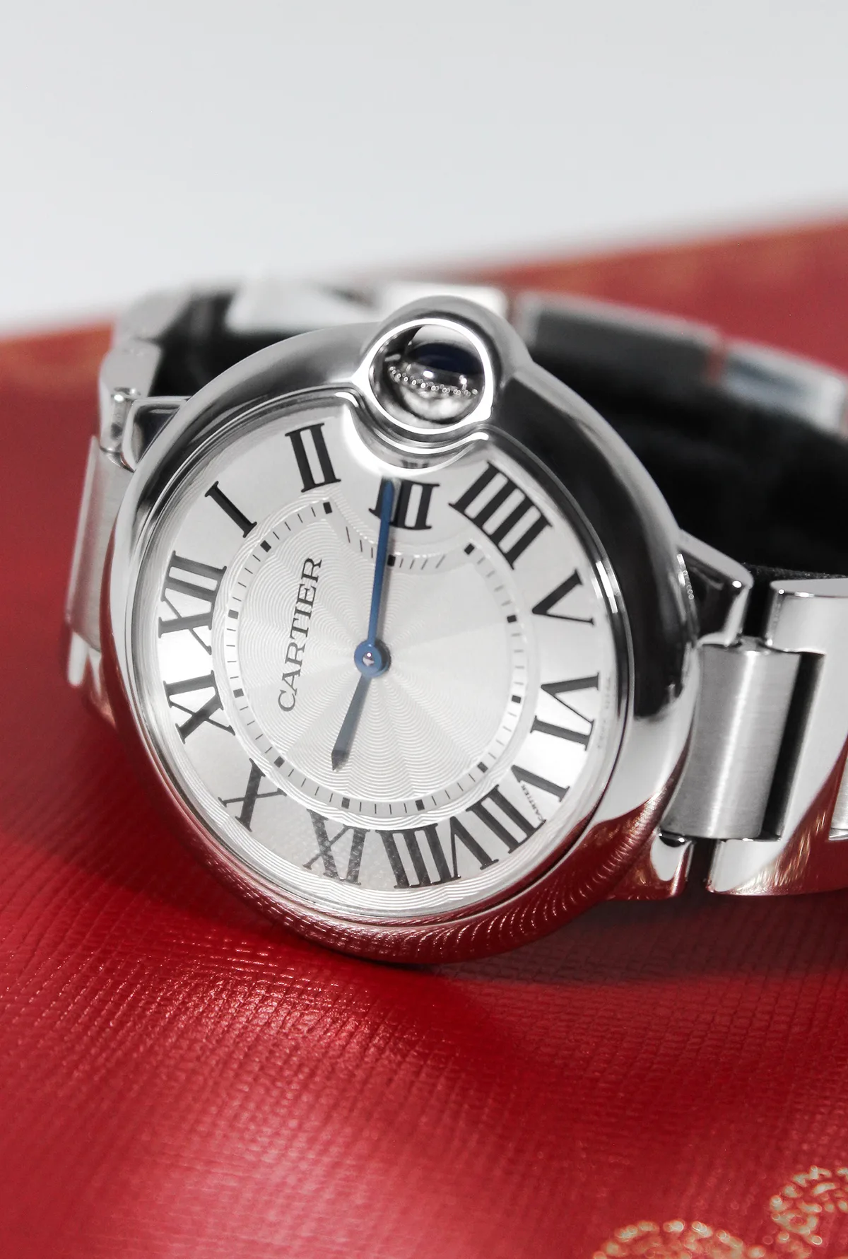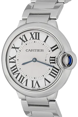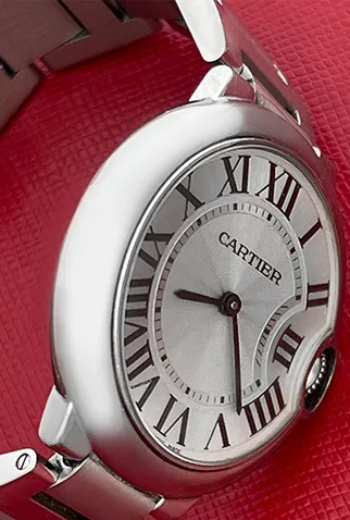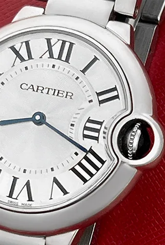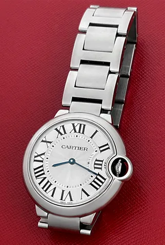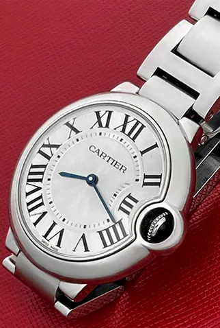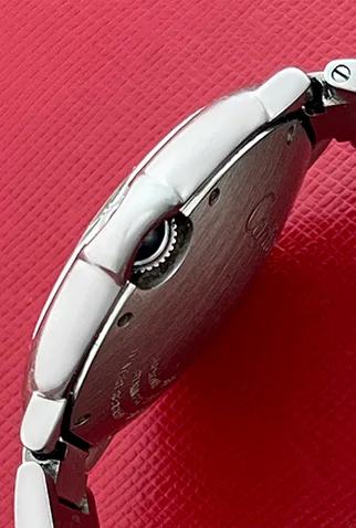Case Material: Stainless Steel round style case with blue sapphire cabachon setting crown (36mm dia.). Water-Resistant to 30 Meters – 100 Feet