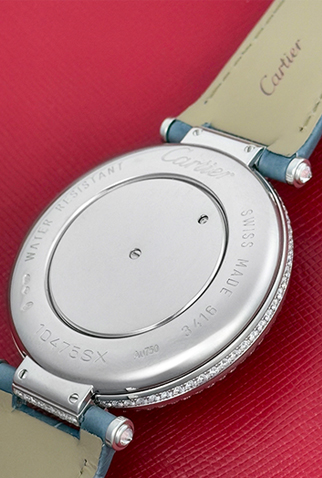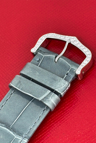 Strap: Gray alligator Cartier strap with 18k White Gold Cartier Diamond buckle