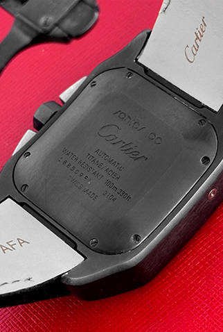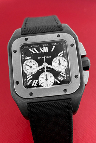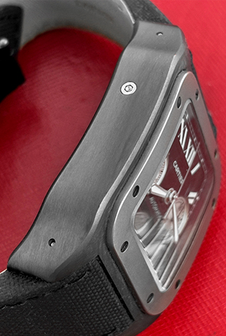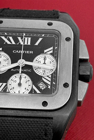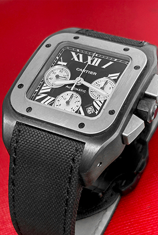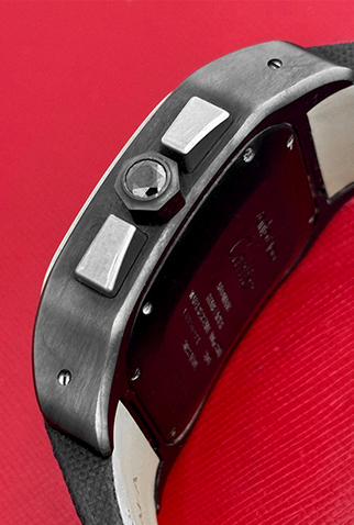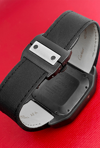 Strap: Black fabric strap with Black (coated with ADLC) Titanium Cartier deployant clasp