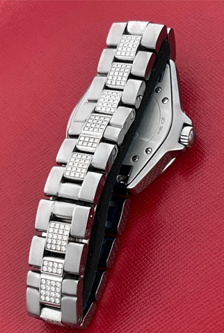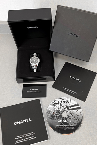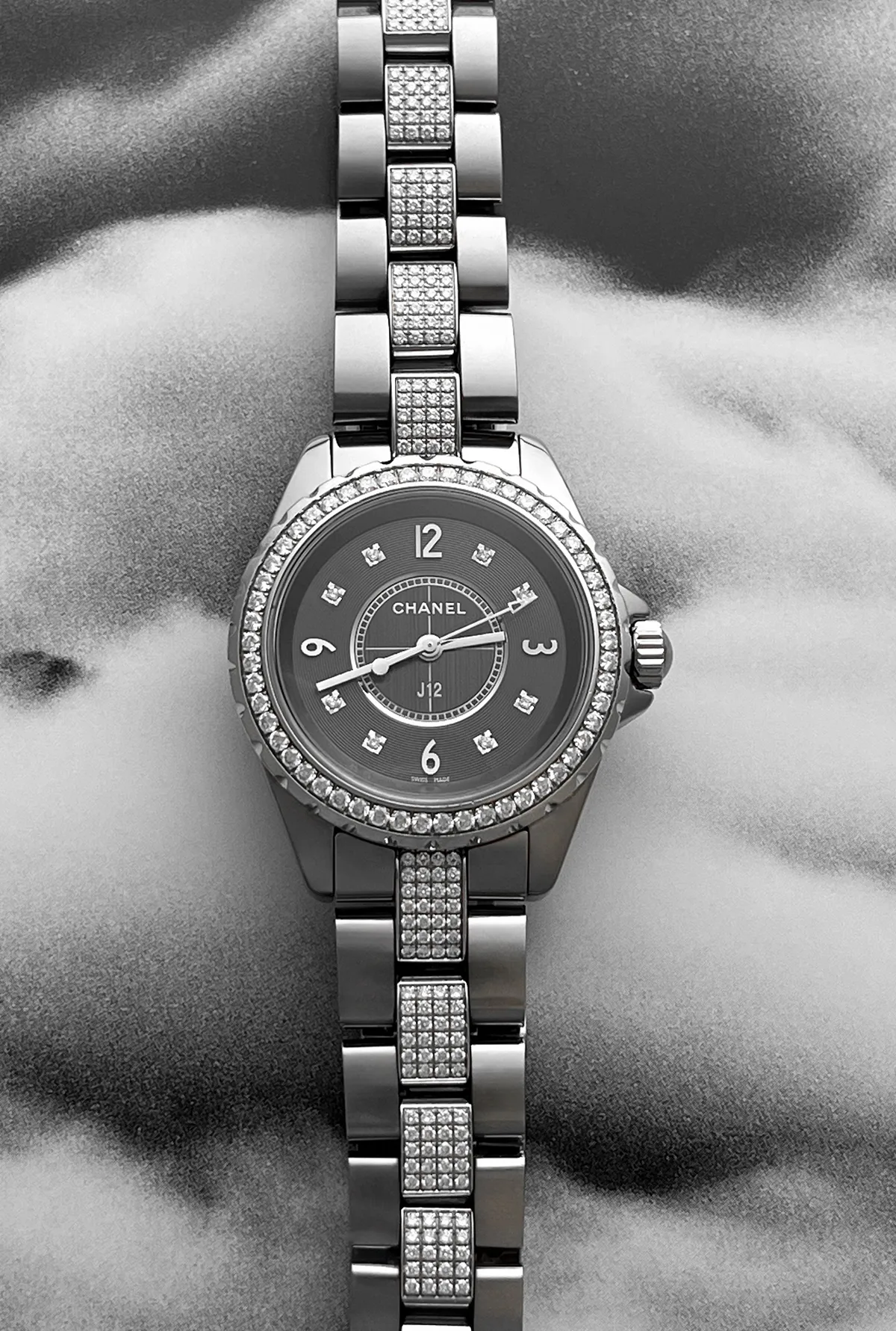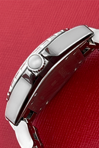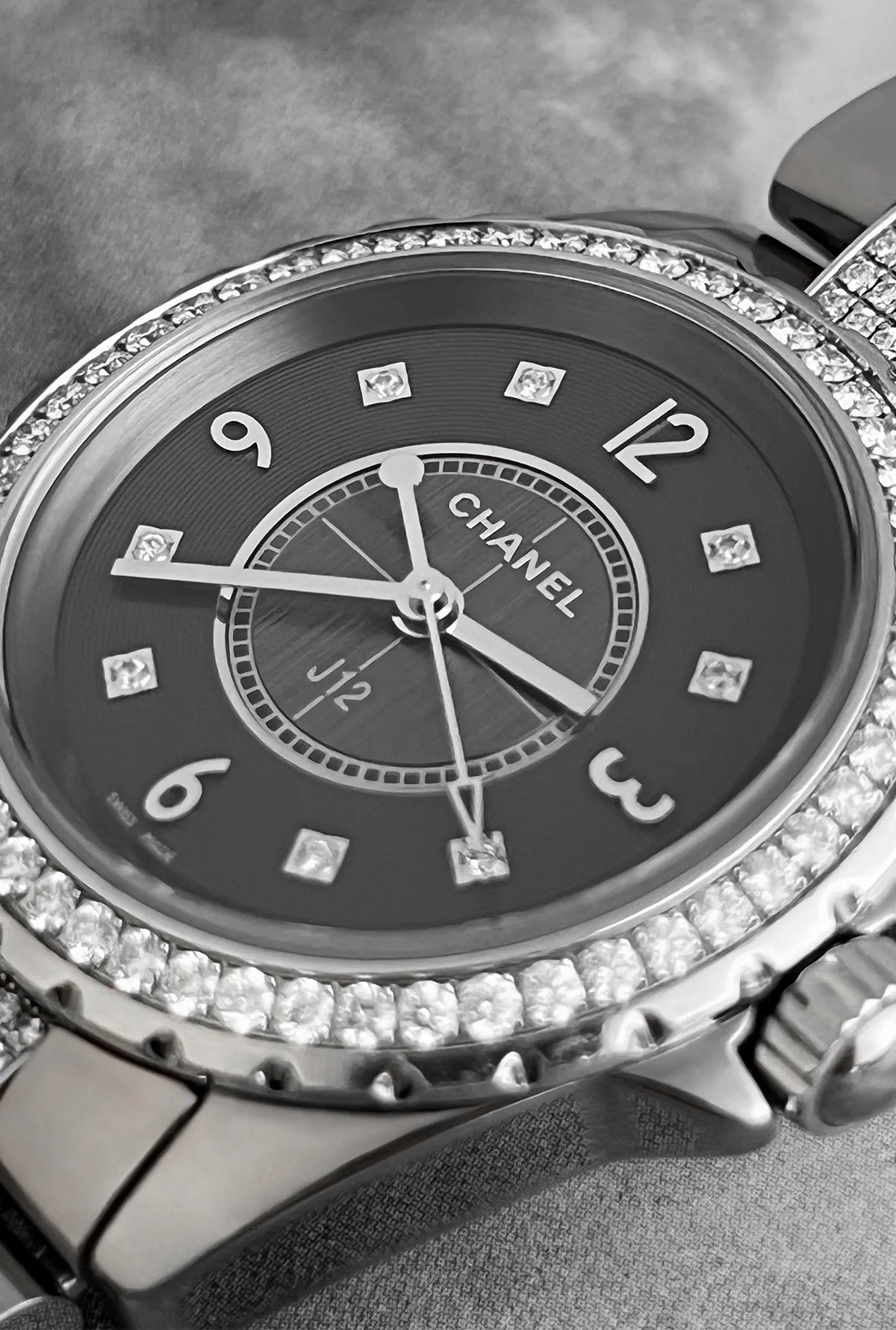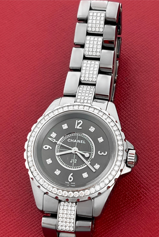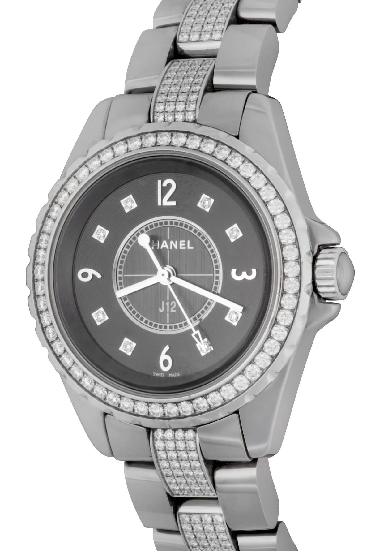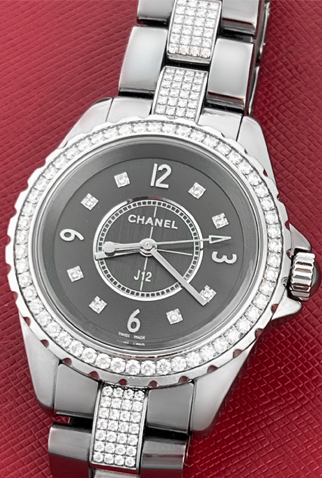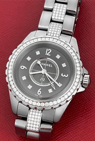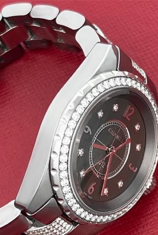 Case Material: Titanium scratch-proof ceramic round style case with Chanel Diamond bezel (33mm dia.). Water Resistant to 50 Meters