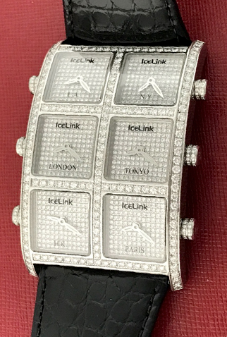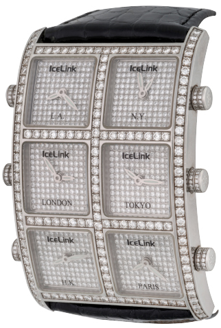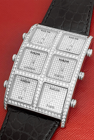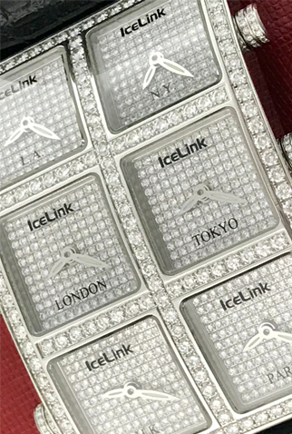 Dial: Six Full Pave Diamond Dials – Each dial can be set independently for six different Time-Zones – L.A., N.Y., London, Tokyo, H.K. & Paris