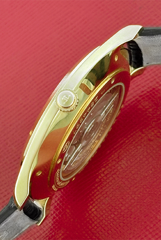 Case Material: Large 18k Rose Gold round style case with exposition back to view movement (40mm dia.). Water Resistant to 50 Meters – 165 Feet