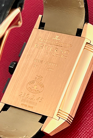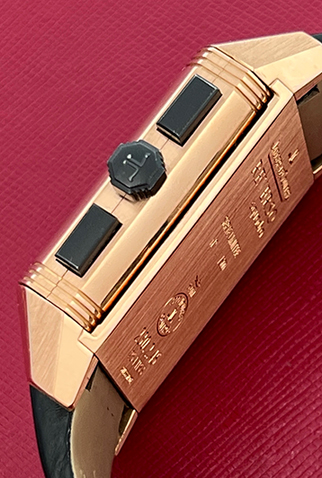 Case Material: Heavy 18k Rose Gold rectangular Reverso style case with exposition back to view movement (35x51mm). Water-Reistant to 50 Meters 165 Feet