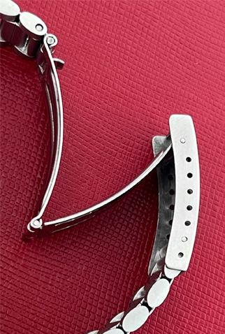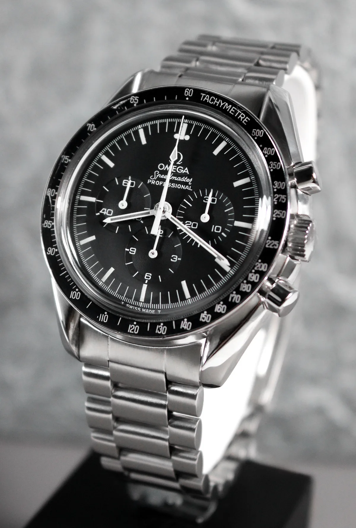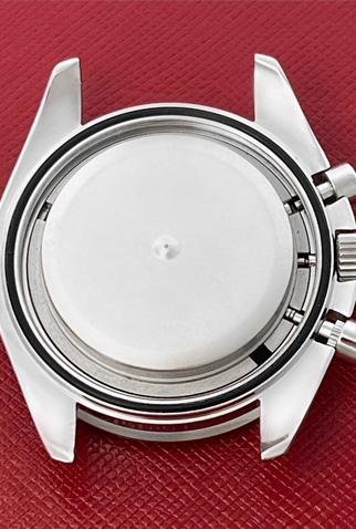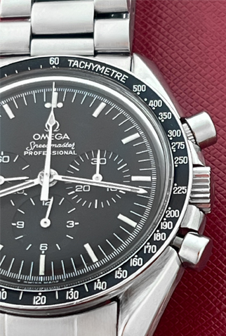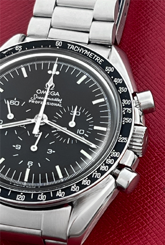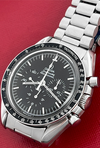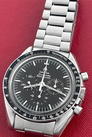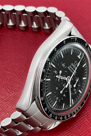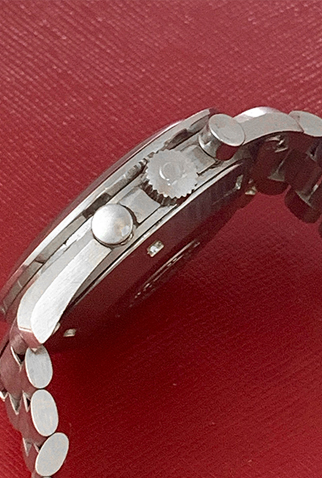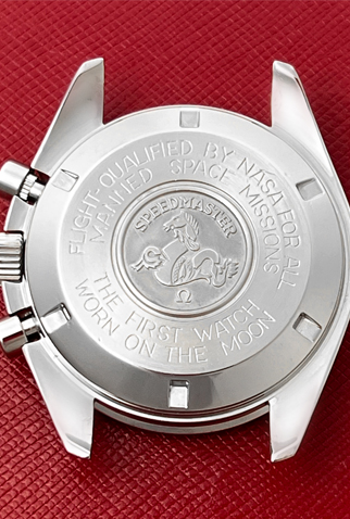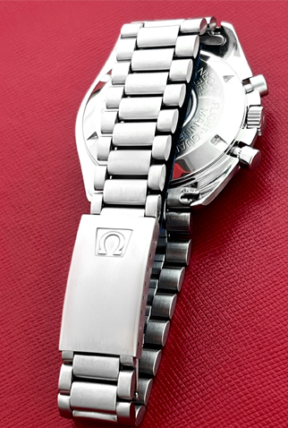 Case Material: Stainless Steel waterproof style case with black Tachymetre bezel (41mm dia.). Signed on case back “Flight Qualified By NASA For All Manned Space Missions – The First Watch Worn On The Moon”