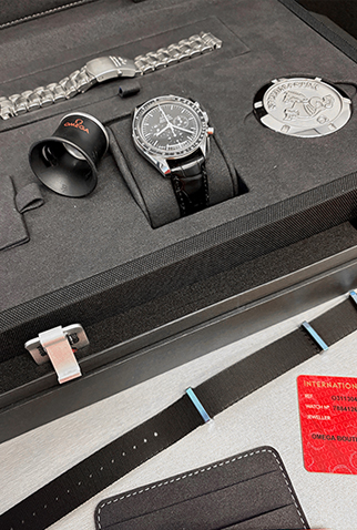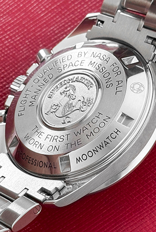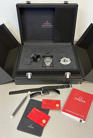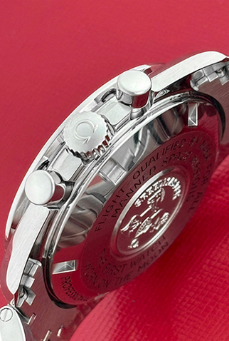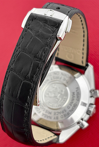 Case Material: Stainless Steel case signed on case back signed “Flight-Qualified By NASA For All Manned Space Missions First Watch Worn On The Moon” (42mm dia.). Water resistant 50 meters / 165 feet.