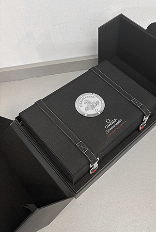 Additional Information: Special large Omega trunk style box, warranty cards, extra black alligator strap, black NATO Omega fabric strap, strap removal tool & Omega signed eye loop