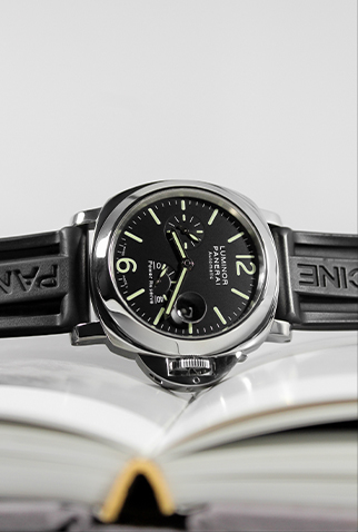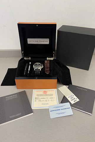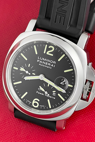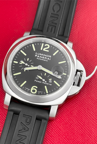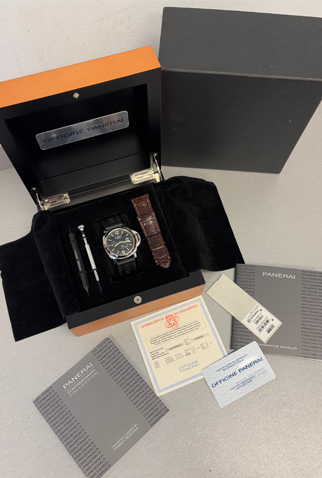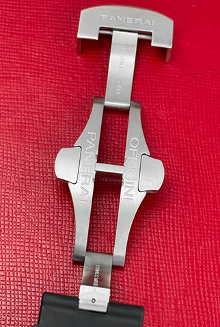 Strap: Black rubber strap with Stainless Steel Panerai deployant clasp. Note: Extra Panerai brown alligator strap also included with tools for changing straps