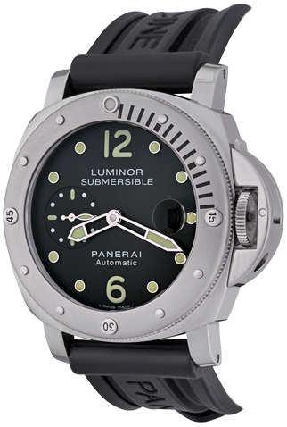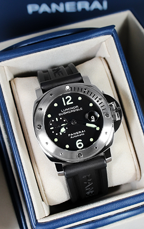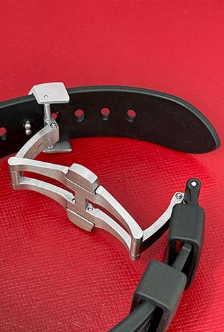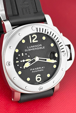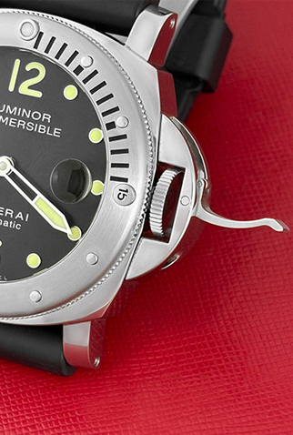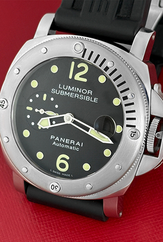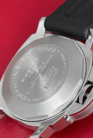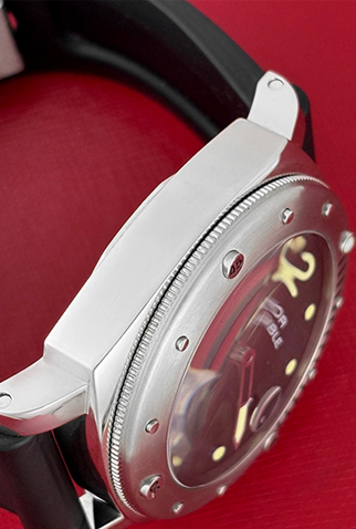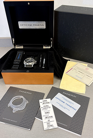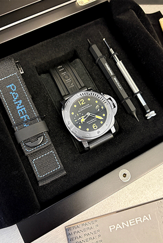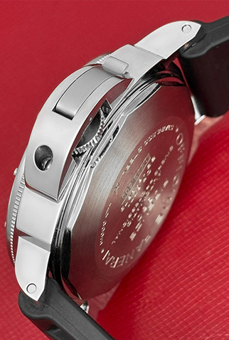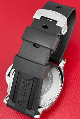 Strap: Black rubber Strap with Stainless Steel Panerai buckle. Note: Extra nylon black & blue Panerai diver’s strap and strap chaining tools included