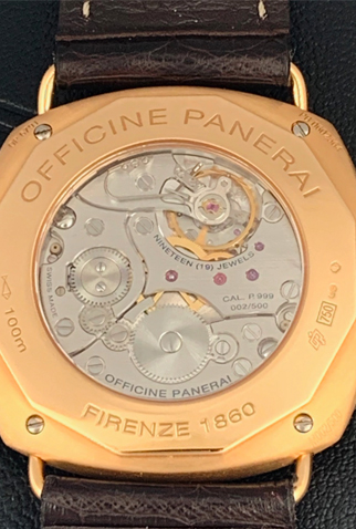 Movement Details: Historic Collection Limited Edition of 500 Individually Numbered Pieces (Series M). Manual Winding Panerai 999 Caliber Movement with Nineteen Jewels Serial 002/500