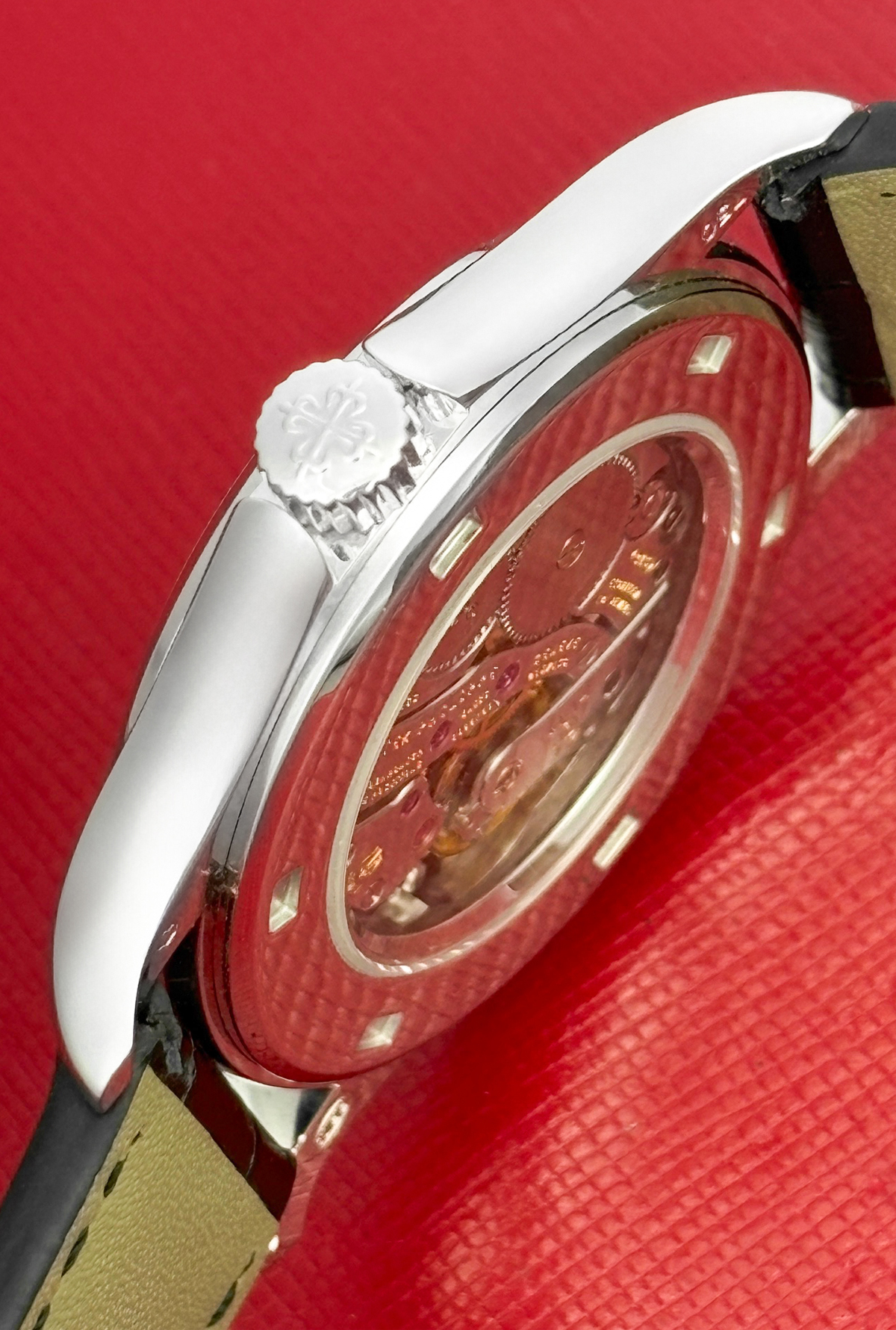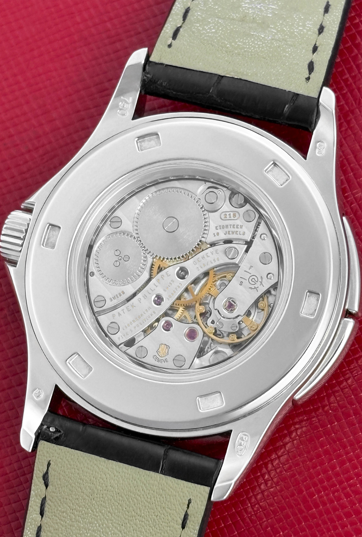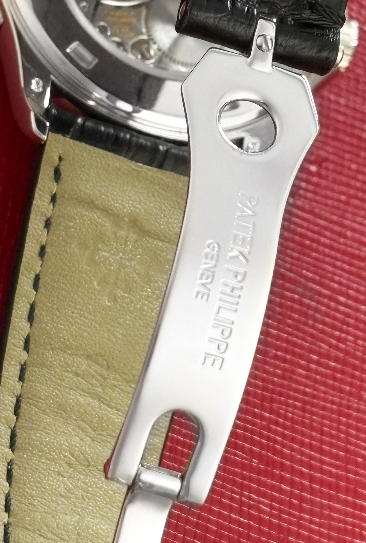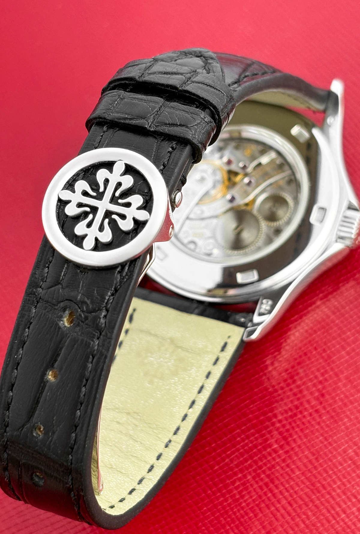 Strap: Black alligator Patek Philippe strap with 18k White Gold Patek Philippe deployant clasp
