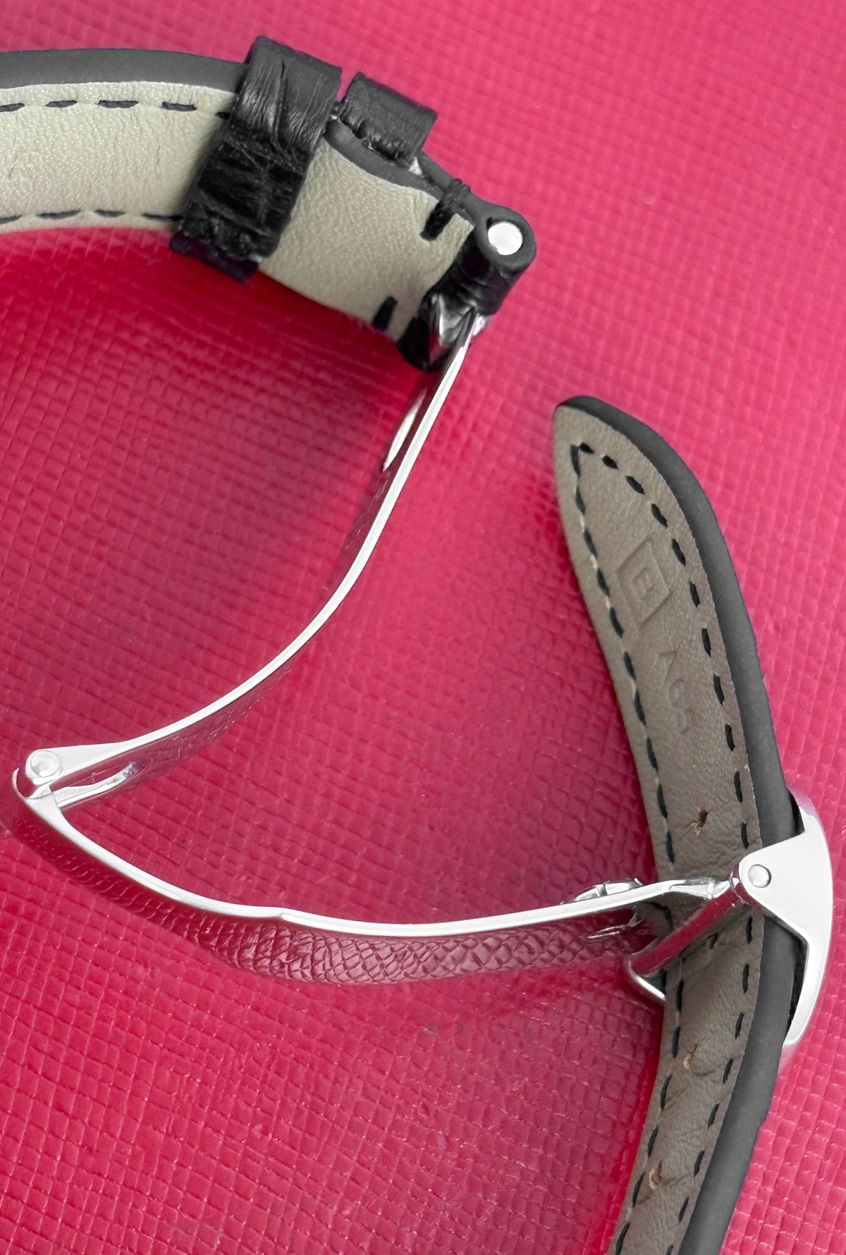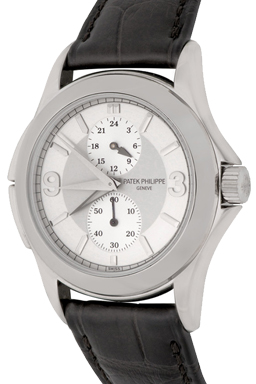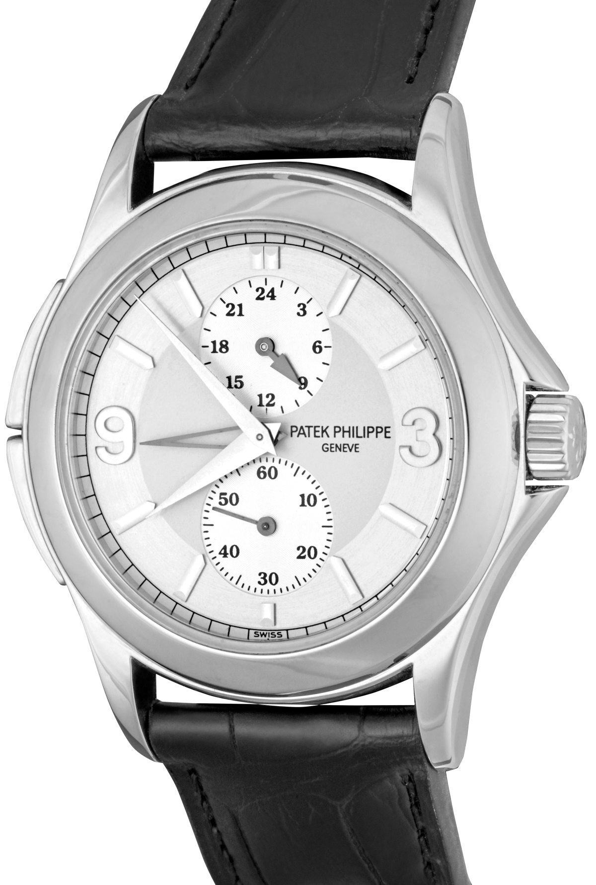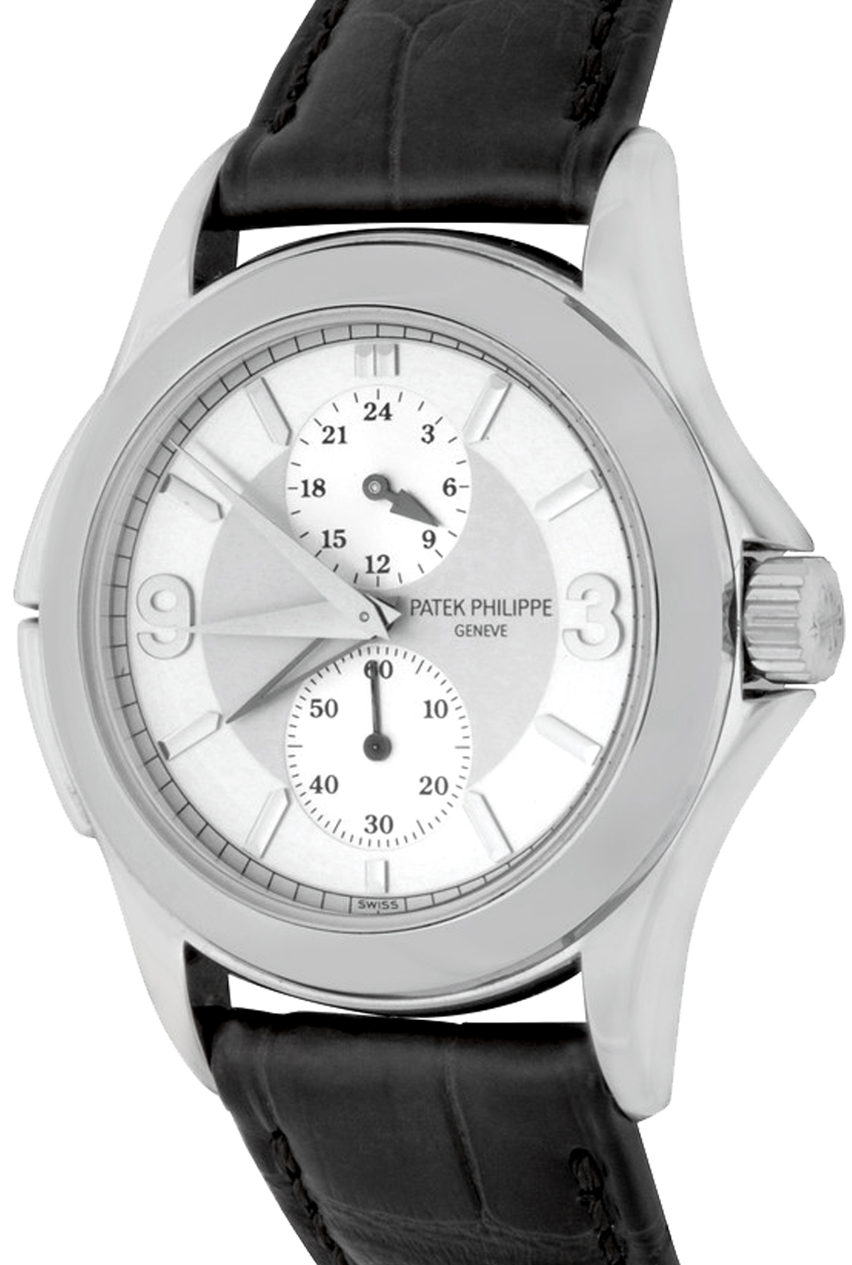 Strap: Black alligator Patek Philippe strap with 18k White Gold Patek Philippe deployant clasp