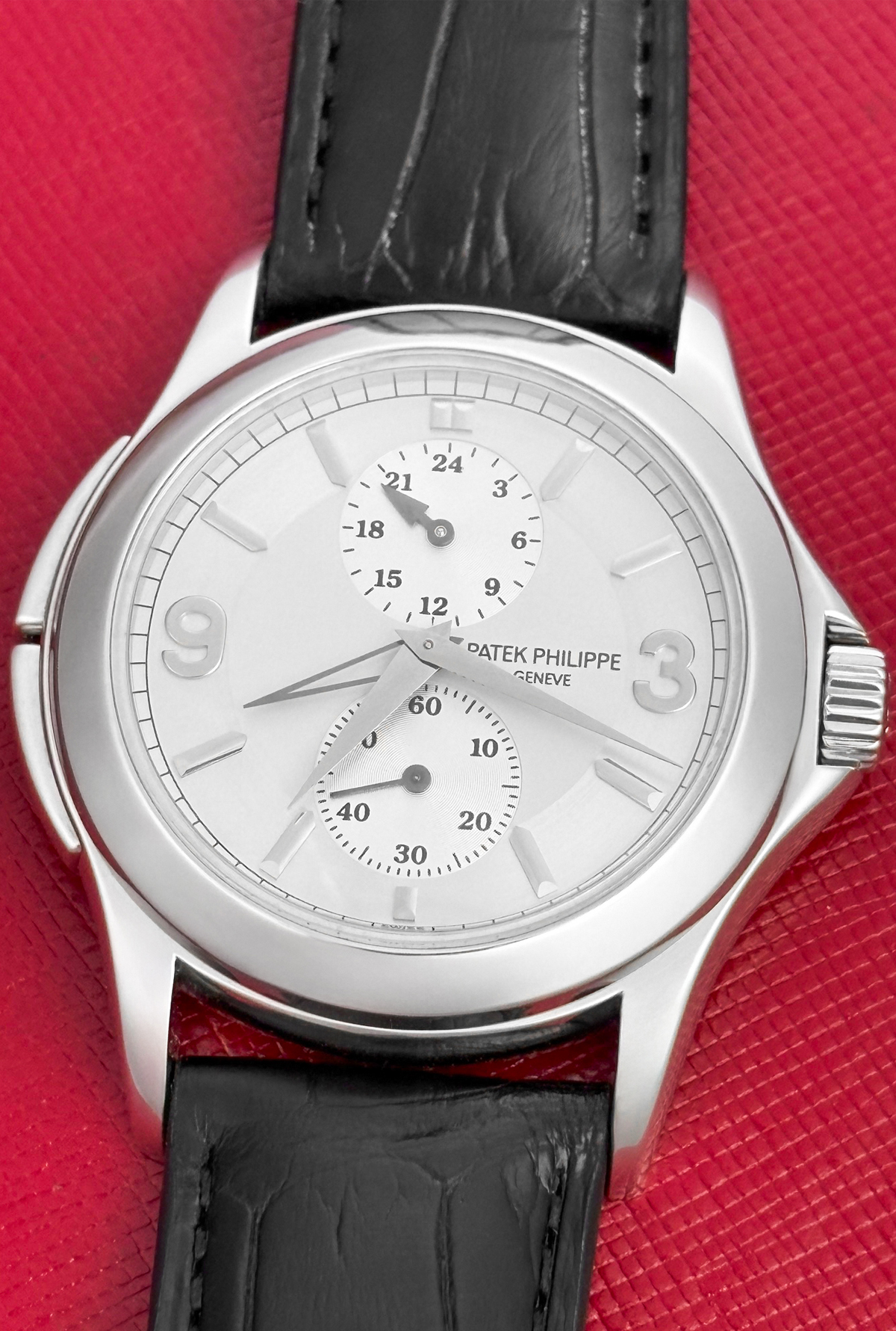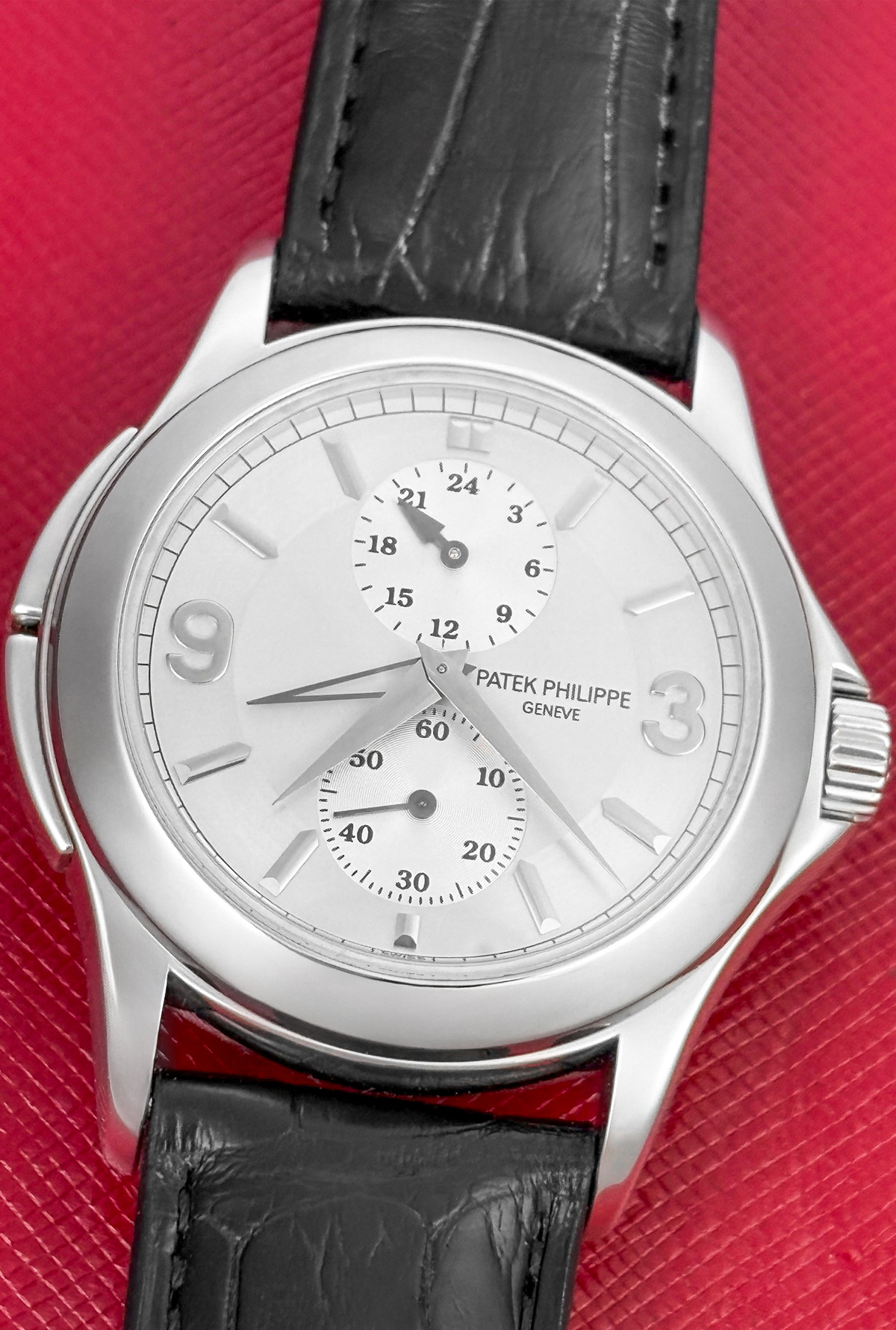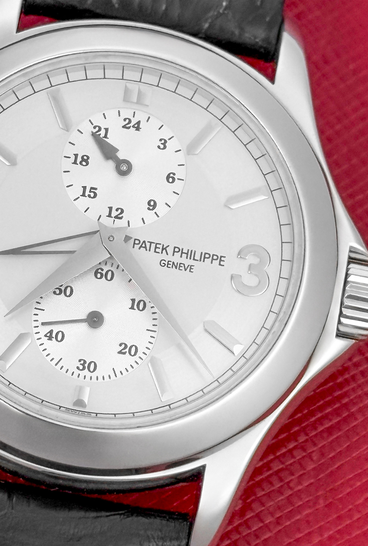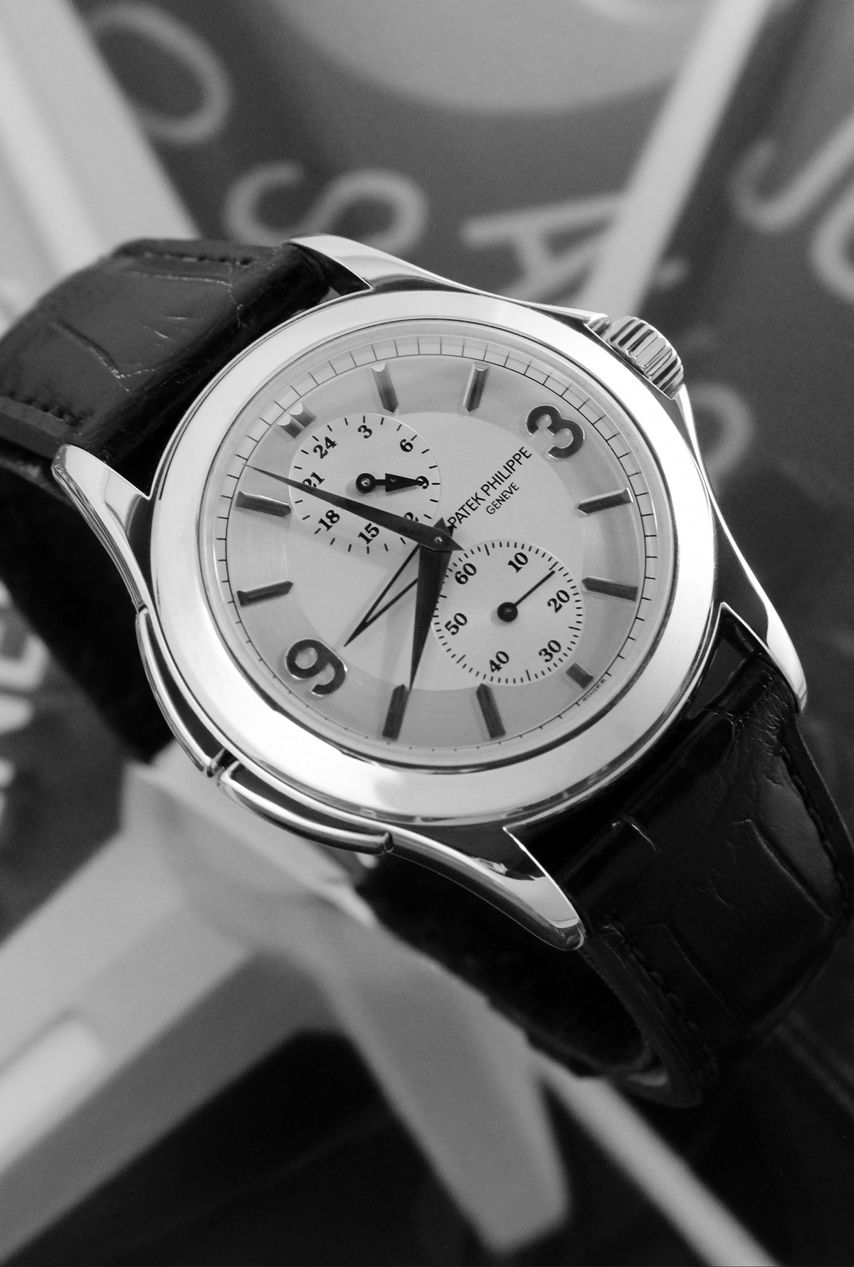 Strap: Black alligator Patek Philippe strap with 18k White Gold Patek Philippe deployant clasp