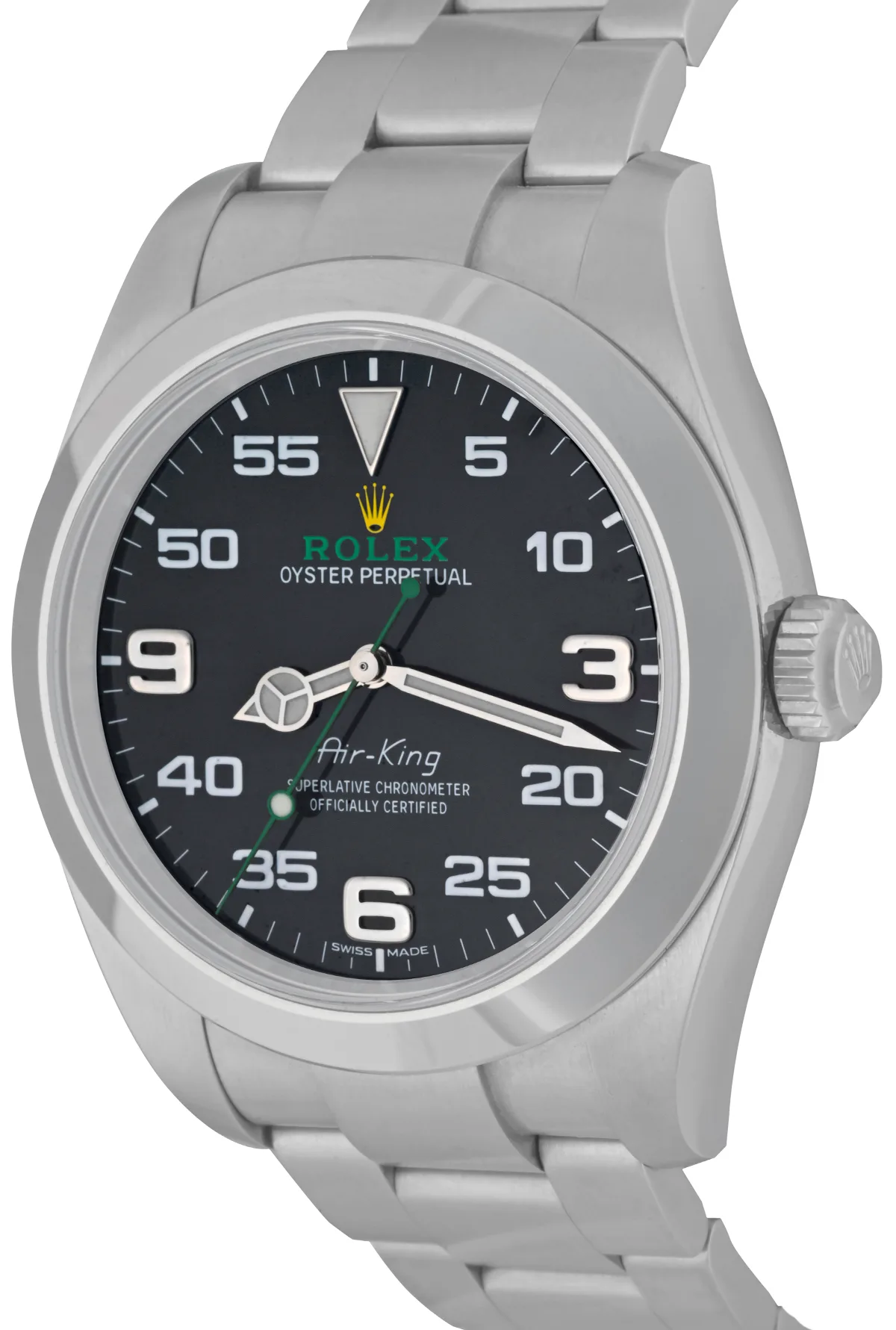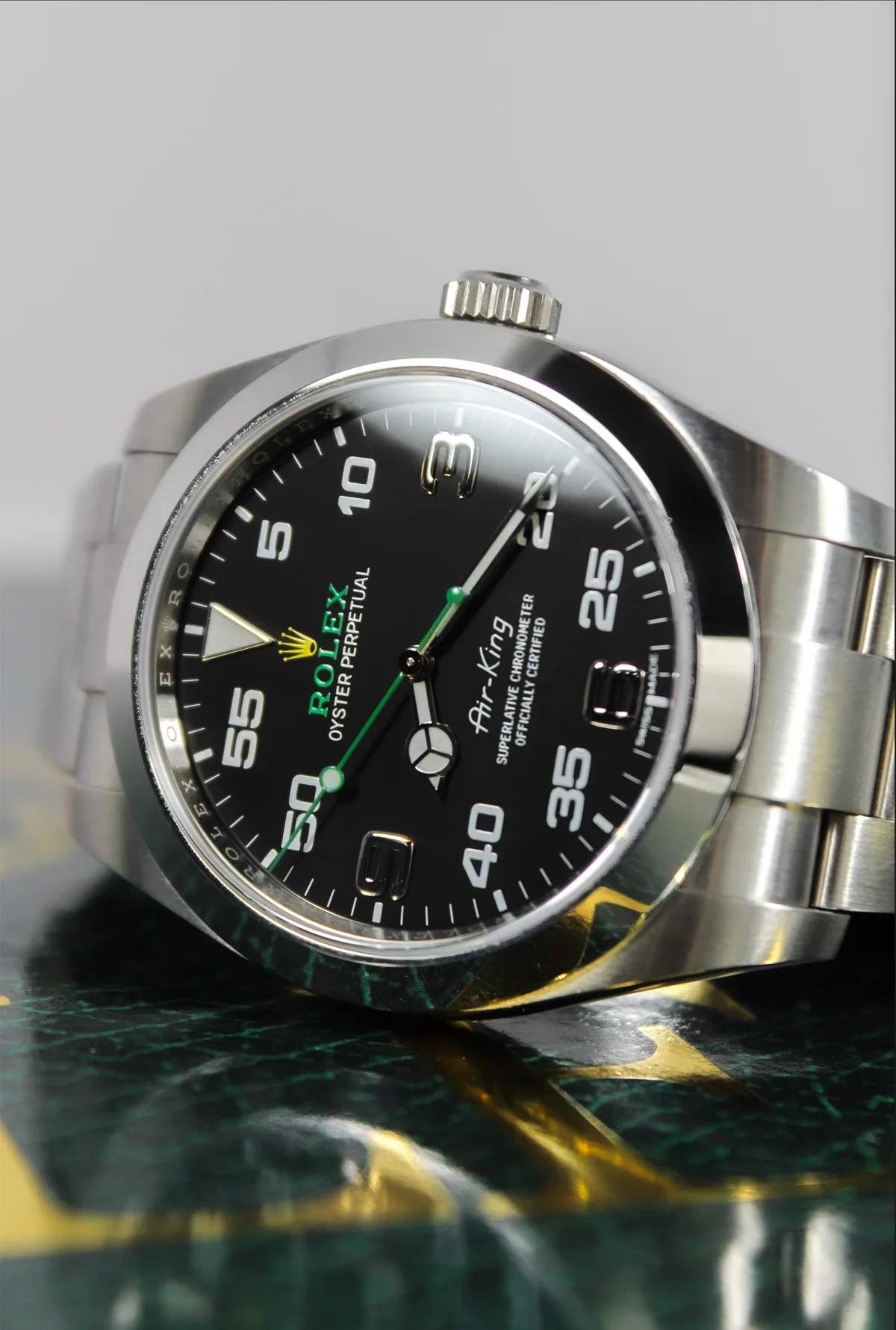 Dial: Black Dial with combination polished and white Arabic numerals. Green sweep seconds hand and “Rolex”