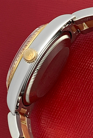 Case Material: Stainless Steel case with 18k Yellow Gold engine-turned bezel (34mm dia.)
