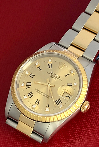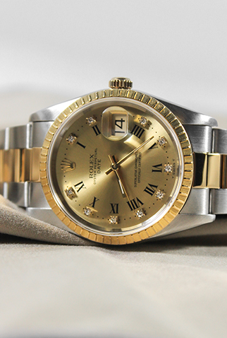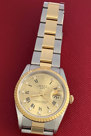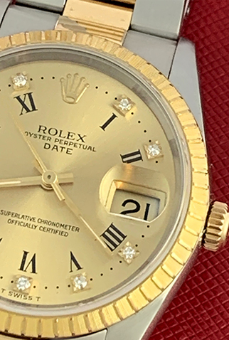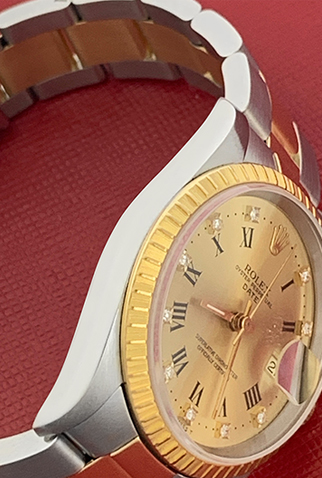 Dial: Champagne Dial with black Roman numerals and Diamond hour markers