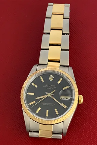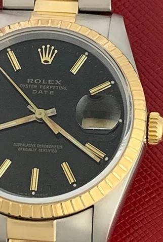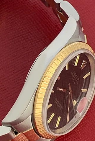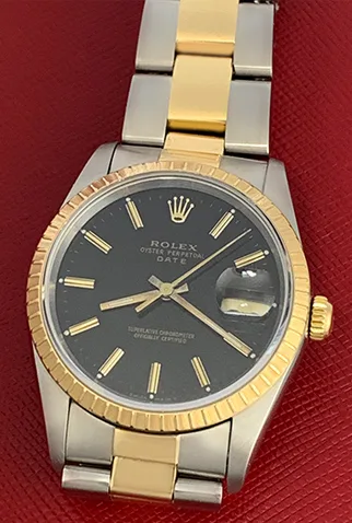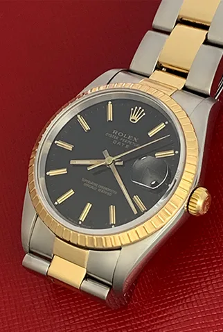 Case Material: Stainless Steel case with 18k Yellow Gold engine-turned bezel (34mm dia.)
