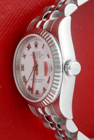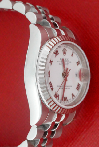 Case Material: Stainless Steel case with 18k White Gold fluted bezel (26mm dia.)