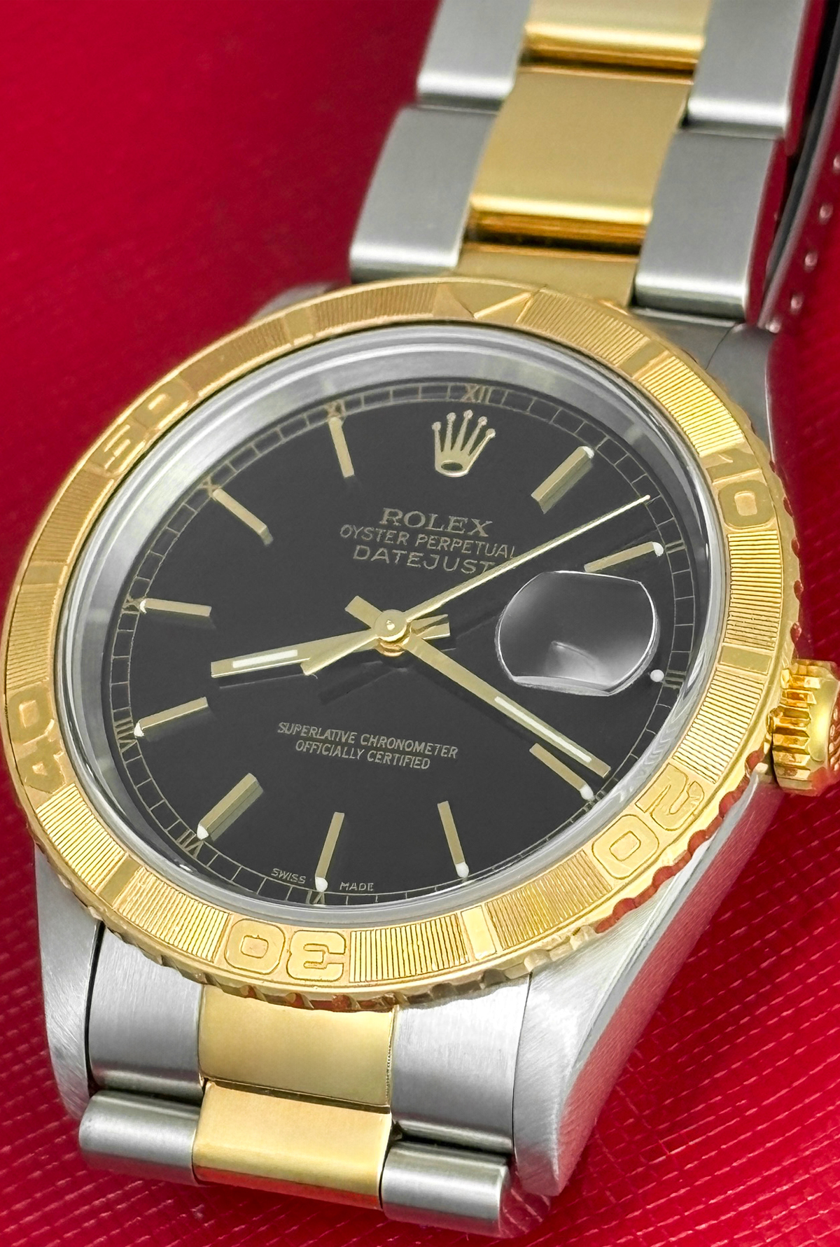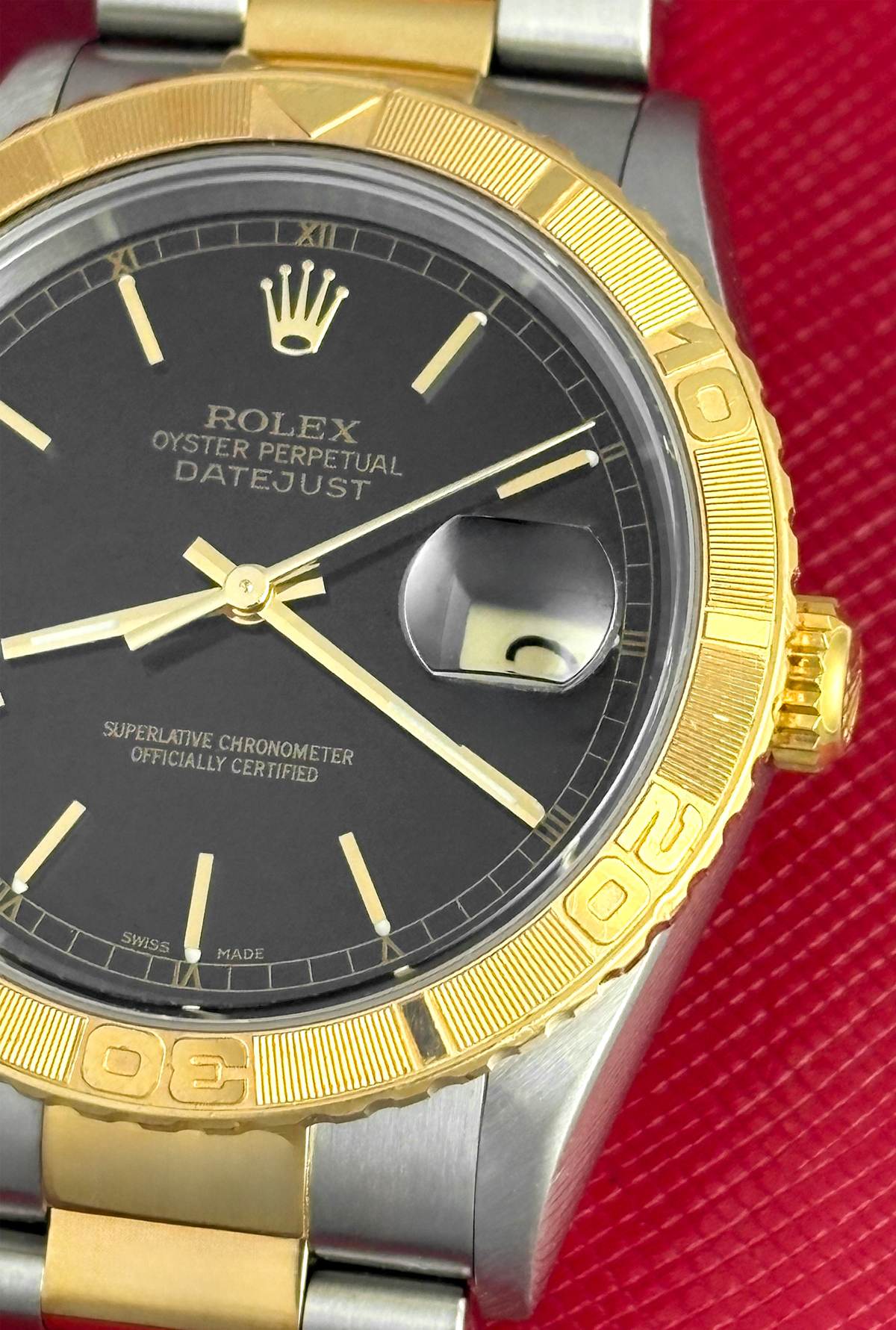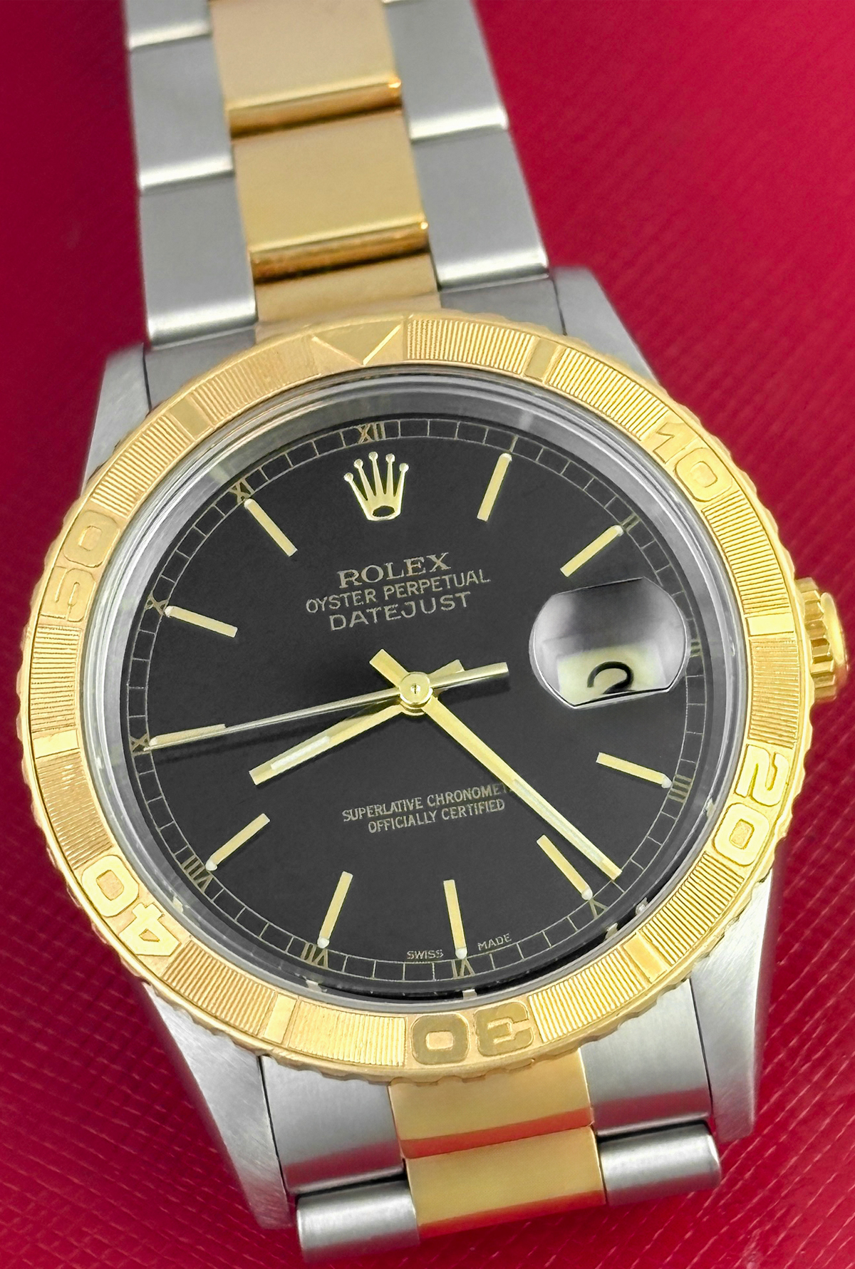 Case Material: Stainless Steel case with 18k Yellow Gold Thunderbird bezel (36mm dia.)