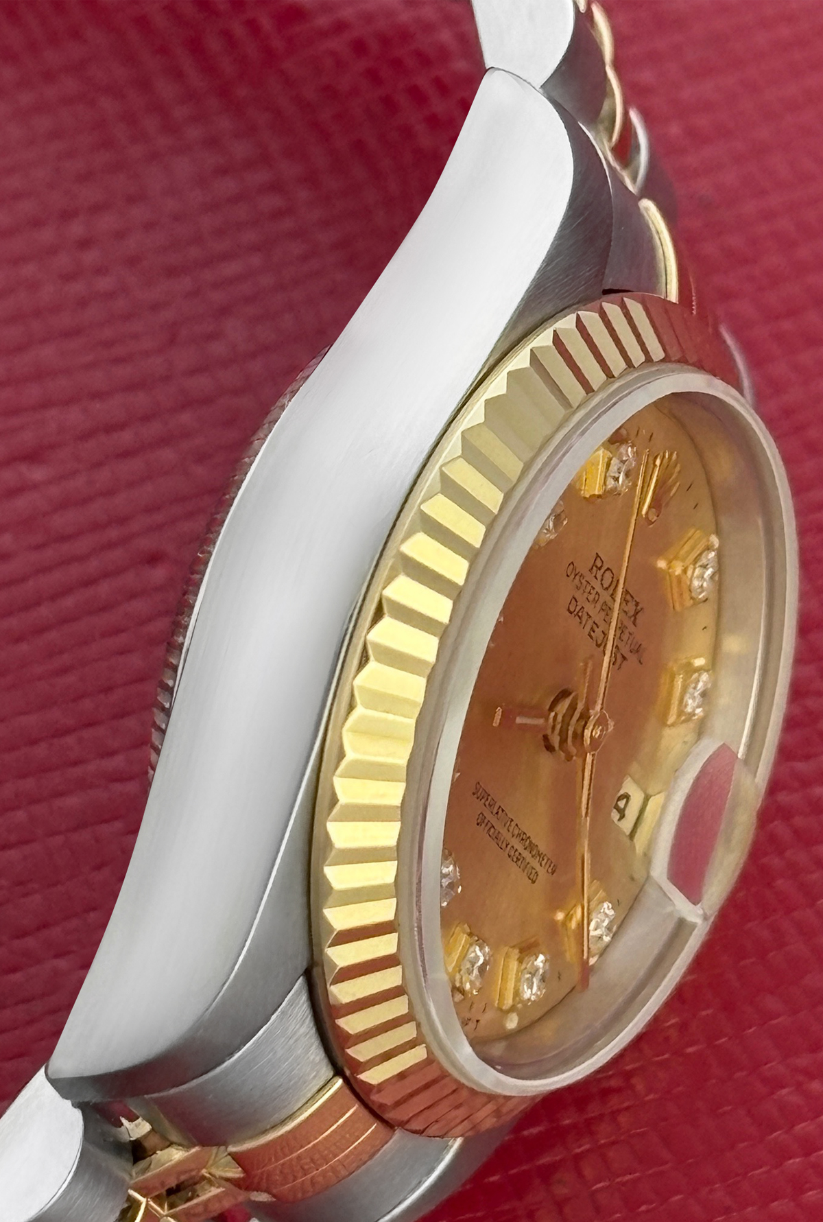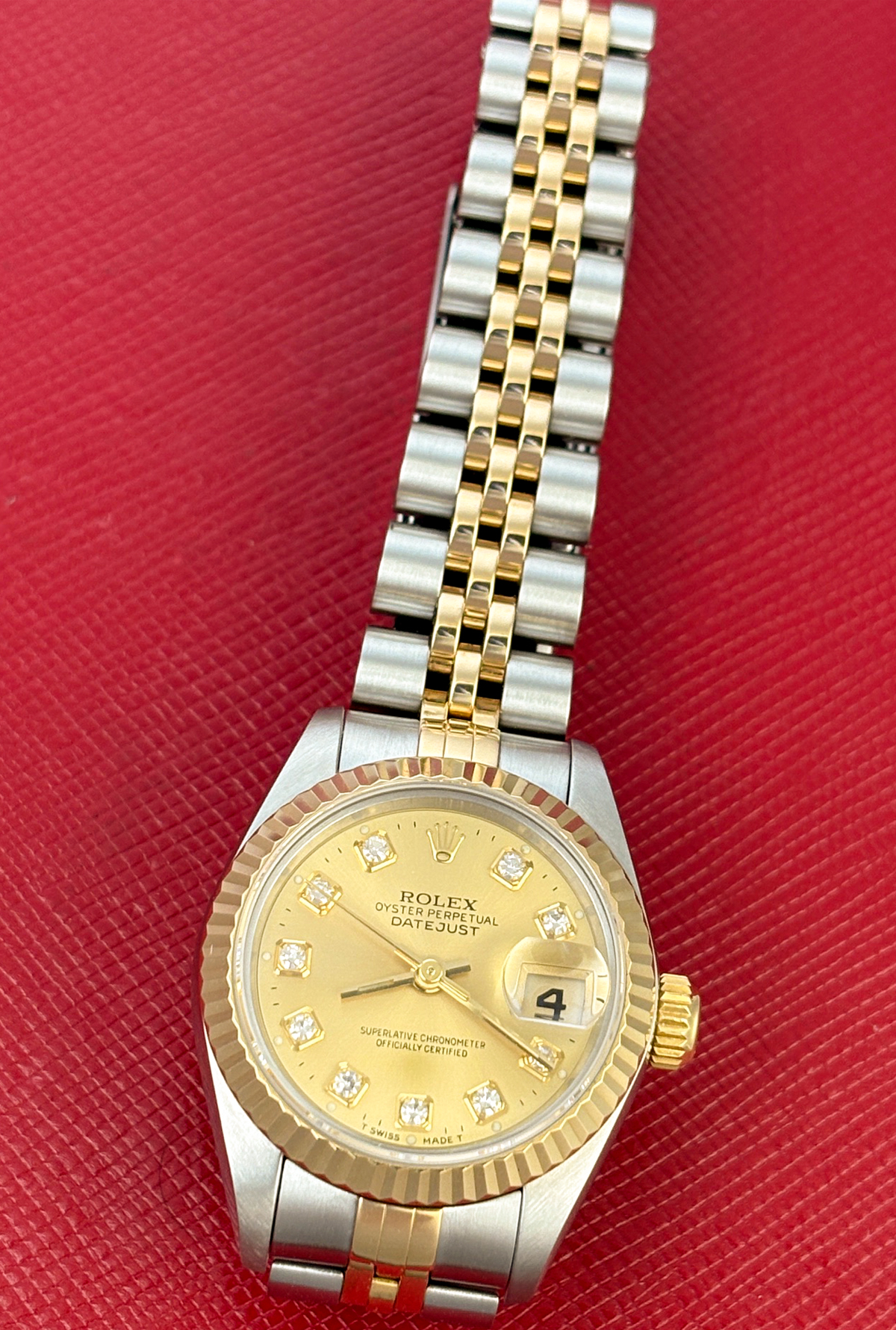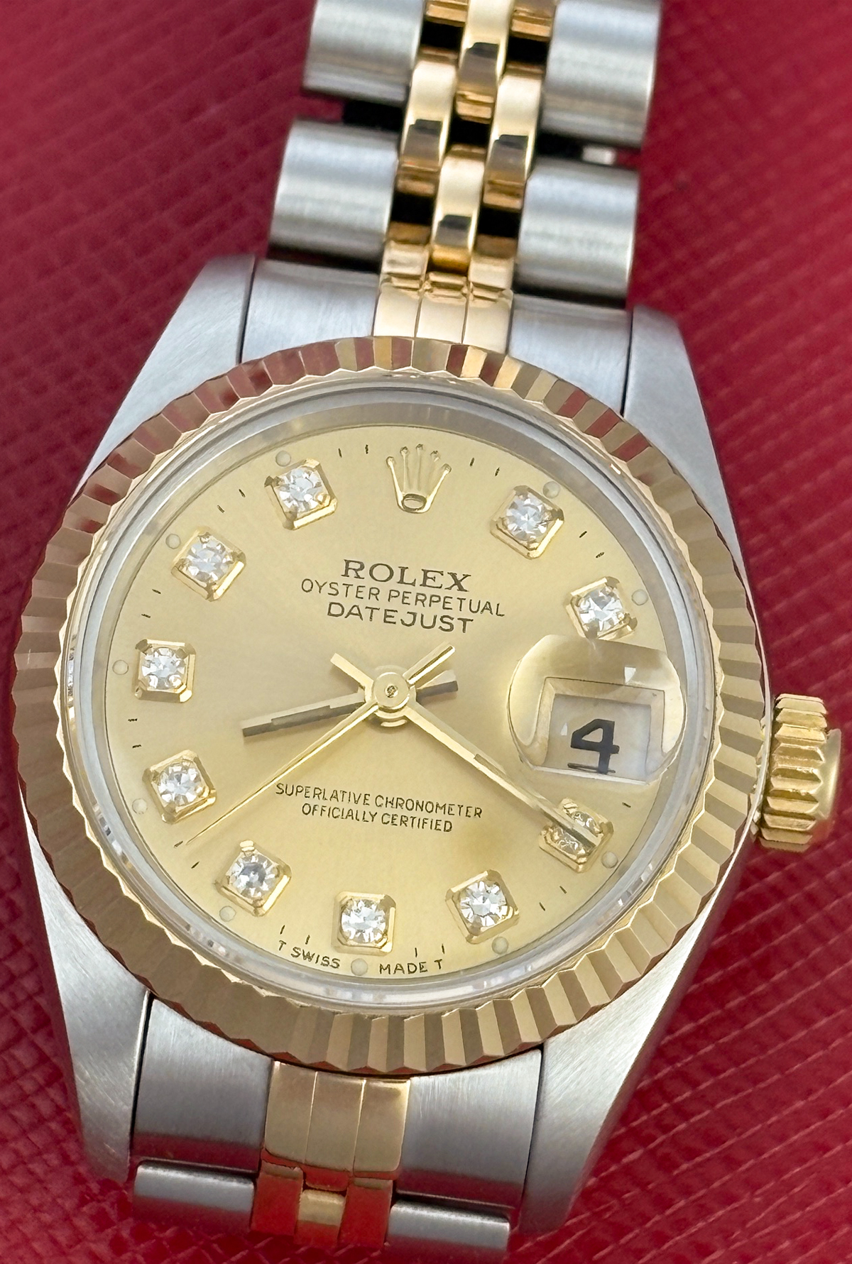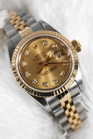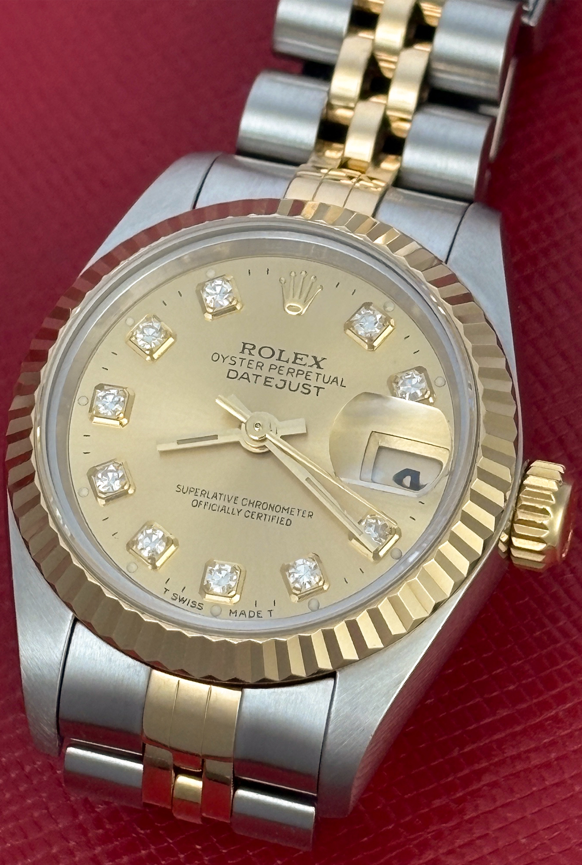 Case Material: Stainless Steel case with 18k Yellow Gold fluted bezel (26mm dia.)