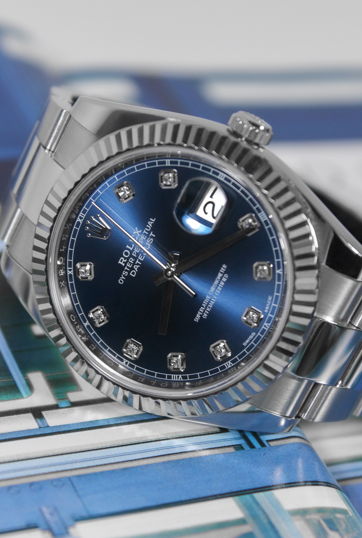 Case Material: Stainless Steel case with 18k White Gold fluted bezel (41mm dia.)