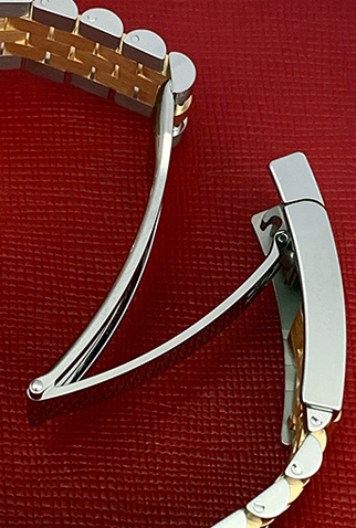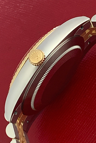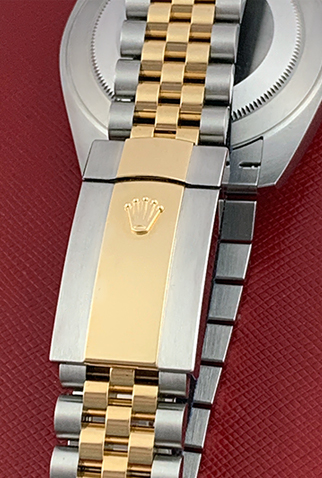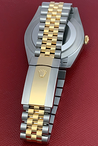 Case Material: Stainless Steel case with 18k Yellow Gold domed bezel (41mm dia.)