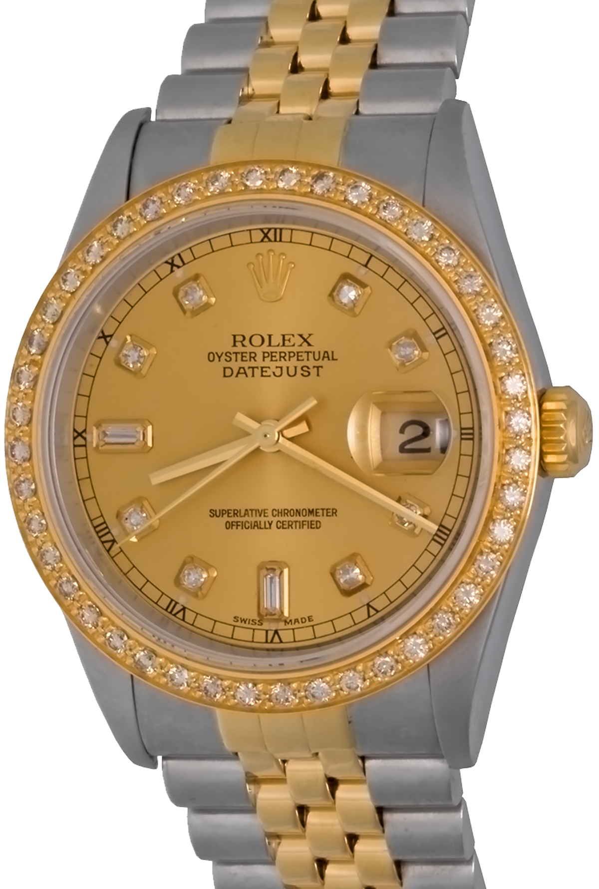 Case Material: Stainless Steel & 18k Yellow Gold custom 1.2 ct. Diamond bezel (36mm dia.)