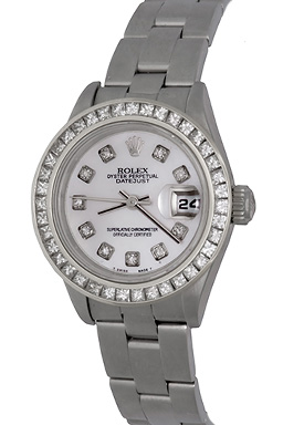 Case Material: Stainless Steel case with 18k White Gold custom 1.5 ct. Princess channel set Diamond bezel (26mm dia.)