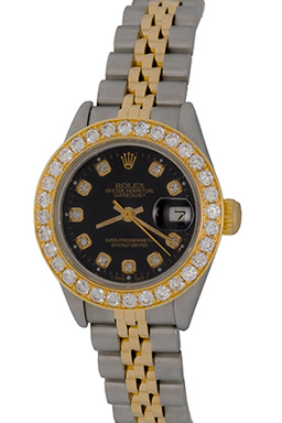 Case Material: Stainless Steel and 18k Yellow Gold case with custom 1.6 ct. Diamond bezel (26mm dia.)