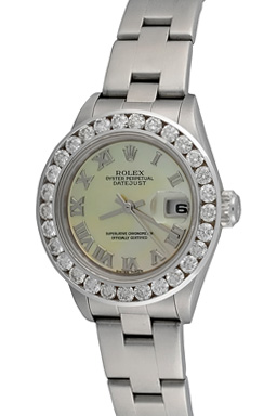 Case Material: Stainless Steel case with custom 18k White Gold 2.15 ct. channel set Diamond bezel (26mm dia.)