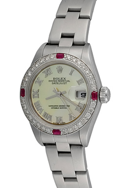 Case Material: Stainless Steel case with custom 18k White Gold Diamond and Ruby bezel (26mm dia.)