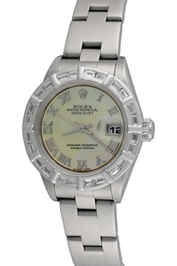 Case Material: Stainless Steel case with 18k White Gold custom 1.5 ct. baguette Diamond bezel (26mm dia.)