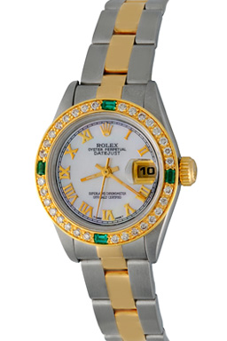 Case Material: Stainless Steel case with custom 18k Yellow Gold Diamond and Emerald bezel (26mm dia.)