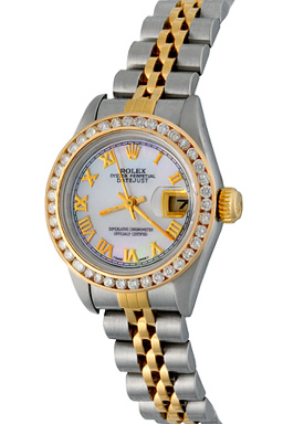 Dial: Custom Mother of Pearl Dial with Yellow Gold Roman numerals