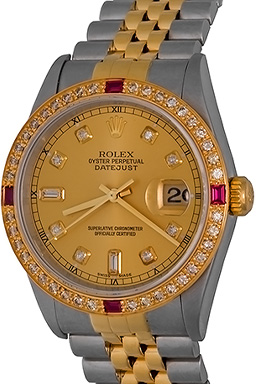 Case Material: Stainless Steel case with Custom 18K Yellow Gold Diamond and Ruby bezel (36mm dia.)
