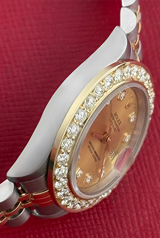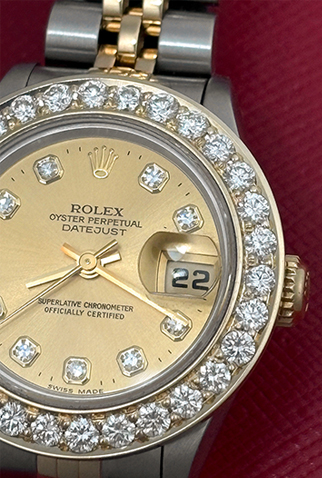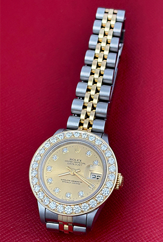 Case Material: Stainless Steel and 18k Yellow Gold case with custom 1.6 ct. Diamond bezel (26mm dia.)