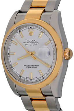 Case Material: Stainless Steel case with 18k Yellow Gold domed bezel (36mm dia.)