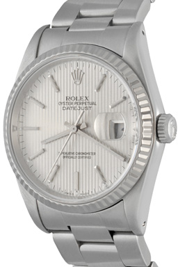 Case Material: Stainless Steel case with 18k White Gold fluted bezel (36mm dia.)