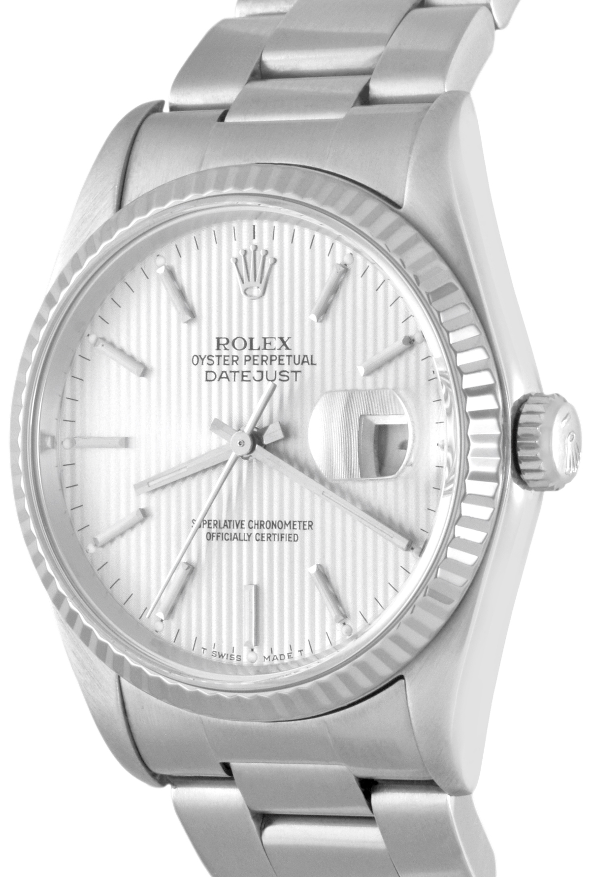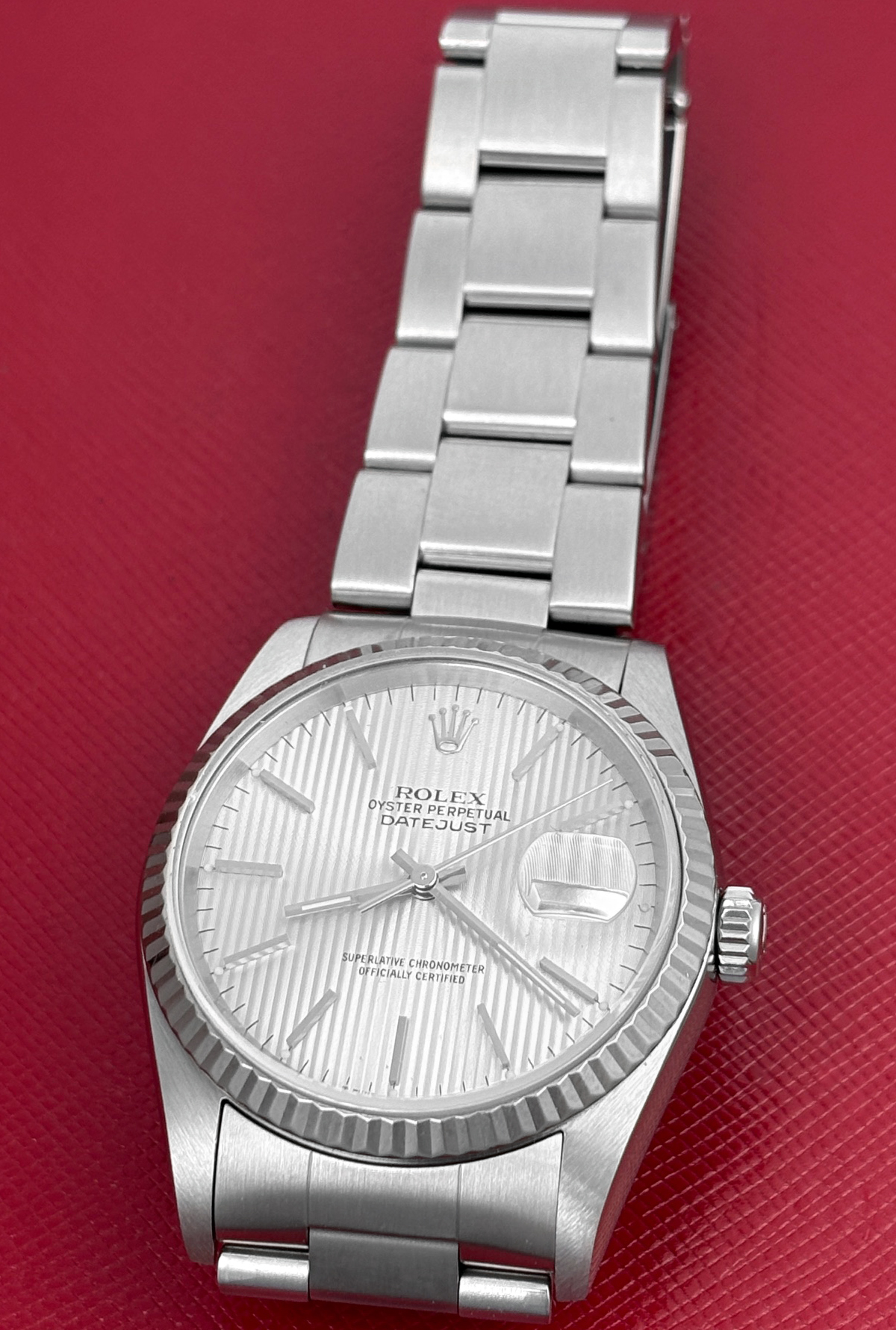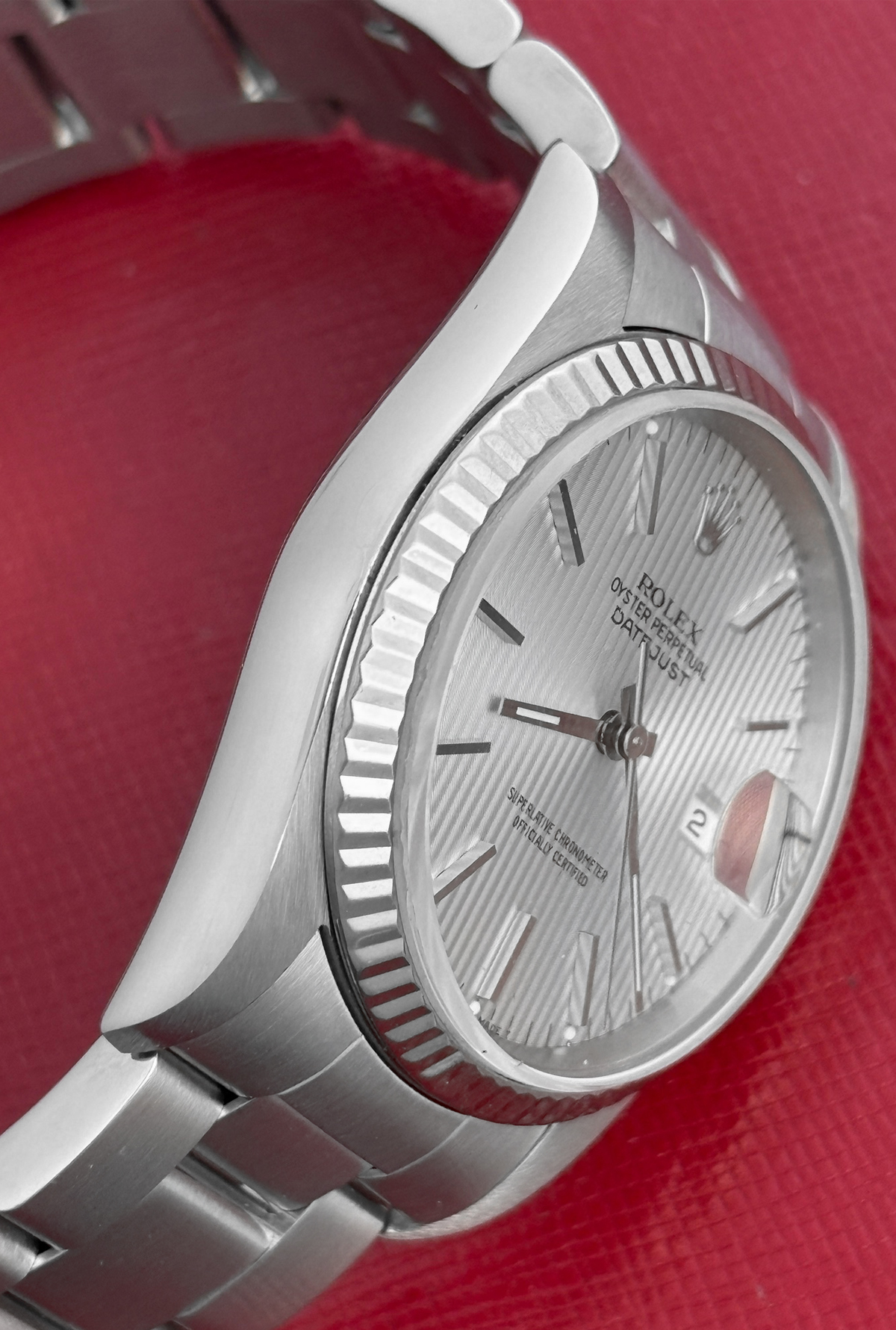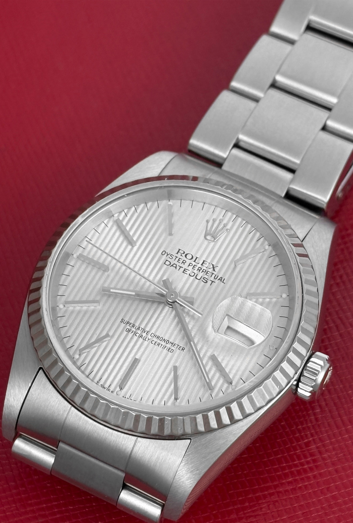 Dial: Oyster Silver Tapestry Dial with polished hour markers