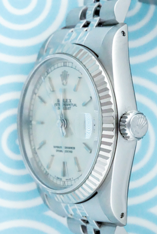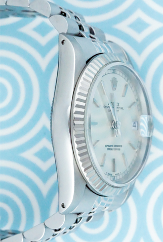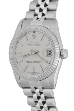 Case Material: Stainless Steel case with 18k White Gold fluted bezel (31mm dia.)
