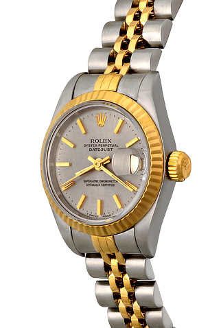 Case Material: Stainless Steel case with 18k Yellow Gold fluted bezel (26mm dia.)