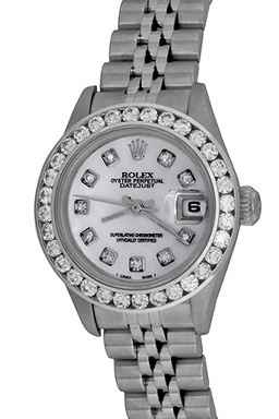 Case Material: Stainless Steel case with custom 18k White Gold 1.6 ct. channel set Diamond bezel (26mm dia.)