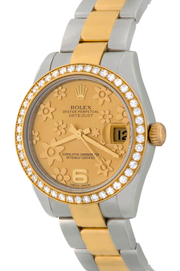Case Material: Stainless Steel case with 18k Yellow Gold Rolex 46 Diamond bezel (31mm dia.)