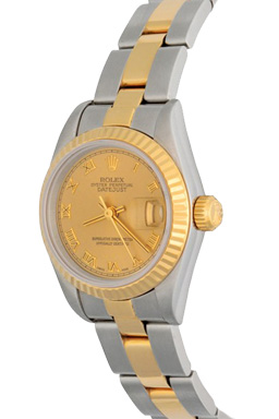 Case Material: Stainless Steel case with 18k Yellow Gold fluted bezel (26mm dia.)