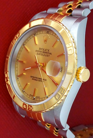Case Material: Stainless Steel case with 18k Yellow Gold Thunderbird bezel (36mm dia.)