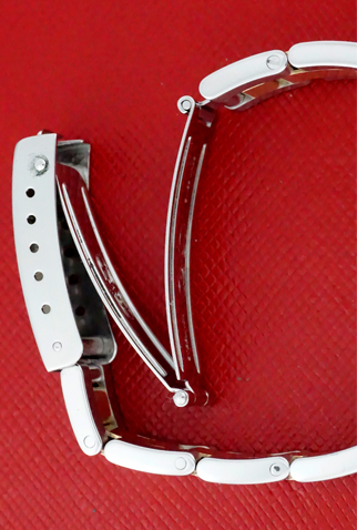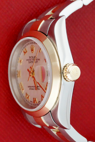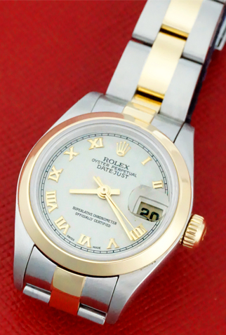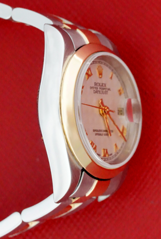Case Material: Stainless Steel case with 18k Yellow Gold smooth bezel (26mm dia.)